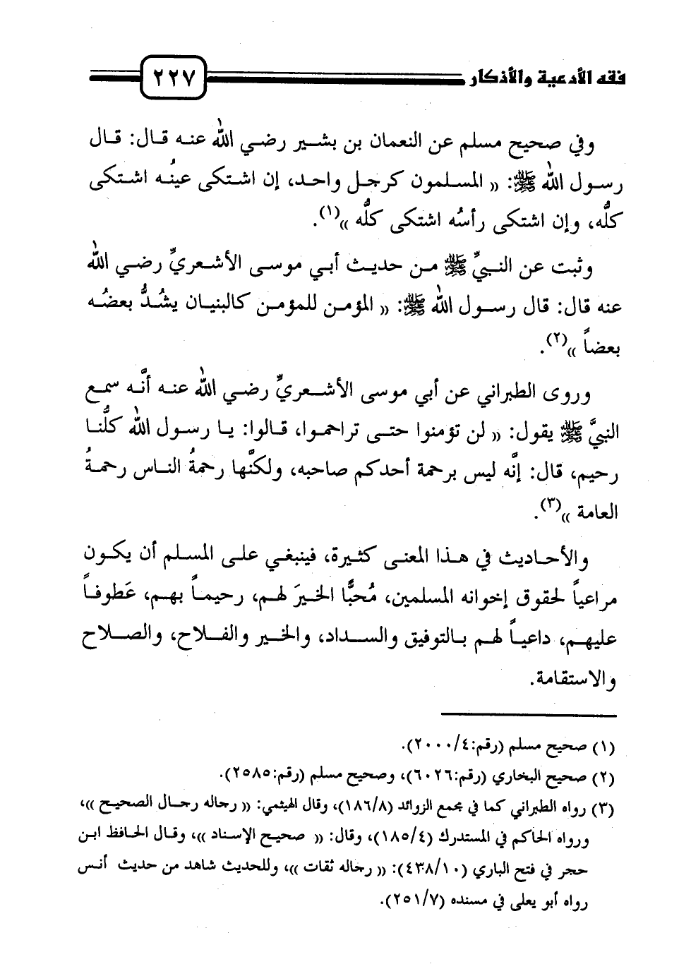 والأحاديث في هذا المعنى كثيرة، فينبغي على المسلم أن يكون مراعياً لحقوق إخوانه المسلمين، مُحبًّا الخيرَ لهم، رحيماً بهم، عَطوفاً عليهم، داعياً لهم بالتوفيق والسداد، والخير والفلاح، والصلاح والاستقامة.