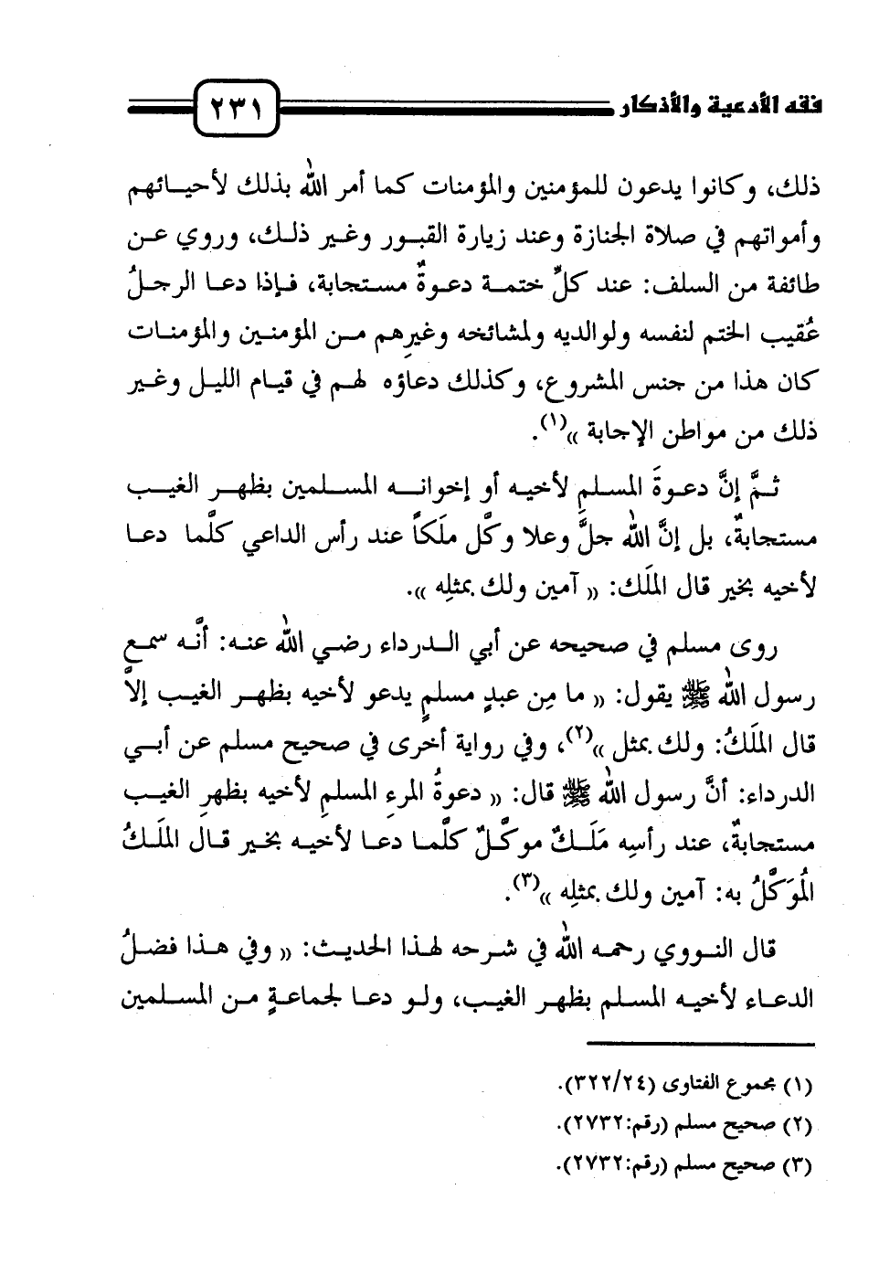 روى مسلم في صحيحه عن أبي الدرداء رضي الله عنه: أنَّه سمع رسول الله صلى الله عليه وسلم يقول: " ما مِن عبدٍ مسلمٍ يدعو لأخيه بظهر الغيب إلاَّ قال الملَكُ: ولك بمثل "2، وفي رواية أخرى في صحيح مسلم عن أبي الدرداء: أنَّ رسول الله صلى الله عليه وسلم قال: " دعوةُ المرءِ المسلمِ لأخيه بظهرِ الغيب مستجابةٌ، عند رأسِه مَلَكٌ موكَّلٌ كلَّما دعا لأخيه بخير قال الملَكُ المُوَكَّلُ به: آمين ولك بمثلِه "3.