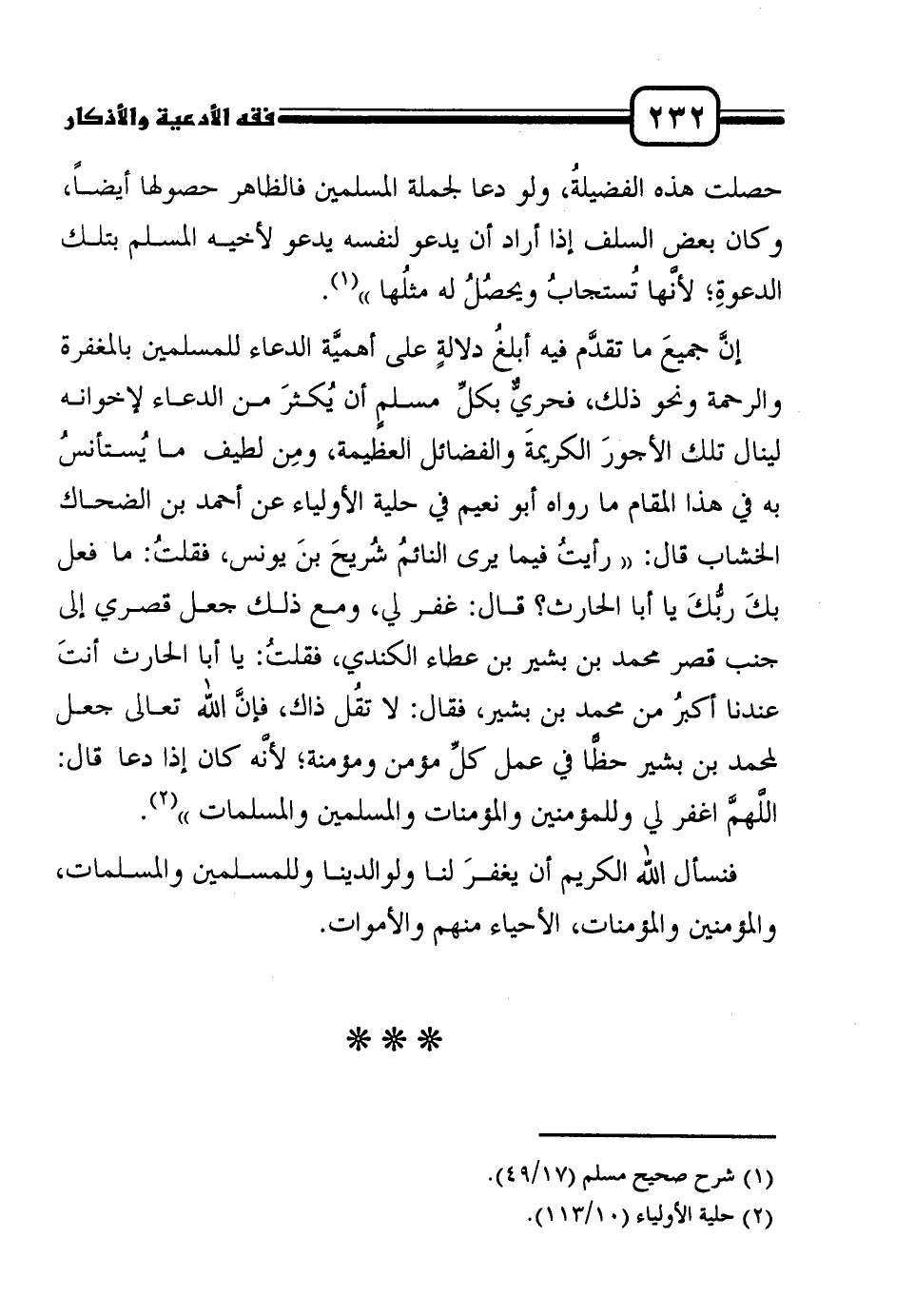 إنَّ جميعَ ما تقدَّم فيه أبلغُ دلالةٍ على أهميَّة الدعاء للمسلمين بالمغفرة والرحمة ونحو ذلك، فحريٌّ بكلِّ مسلمٍ أن يُكثرَ من الدعاء لإخوانه لينال تلك الأجورَ الكريمةَ والفضائل العظيمة، ومِن لطيف ما يُستأنسُ به في هذا المقام ما رواه أبو نعيم في حلية الأولياء عن أحمد بن الضحاك الخشاب قال: " رأيتُ فيما يرى النائمُ شُريحَ بنَ يونس، فقلتُ: ما فعل بكَ ربُّكَ يا أبا الحارث؟ قال: غفر لي، ومع ذلك جعل قصري إلى جنب قصر محمد بن بشير بن عطاء الكندي، فقلتُ: يا أبا الحارث أنتَ عندنا أكبرُ من محمد بن بشير، فقال: لا تقُل ذاك، فإنَّ الله تعالى جعل لمحمد بن بشير حظًّا في عمل كلِّ مؤمن ومؤمنة؛ لأنَّه كان إذا دعا قال: اللَّهمَّ اغفر لي وللمؤمنين والمؤمنات والمسلمين والمسلمات "2.