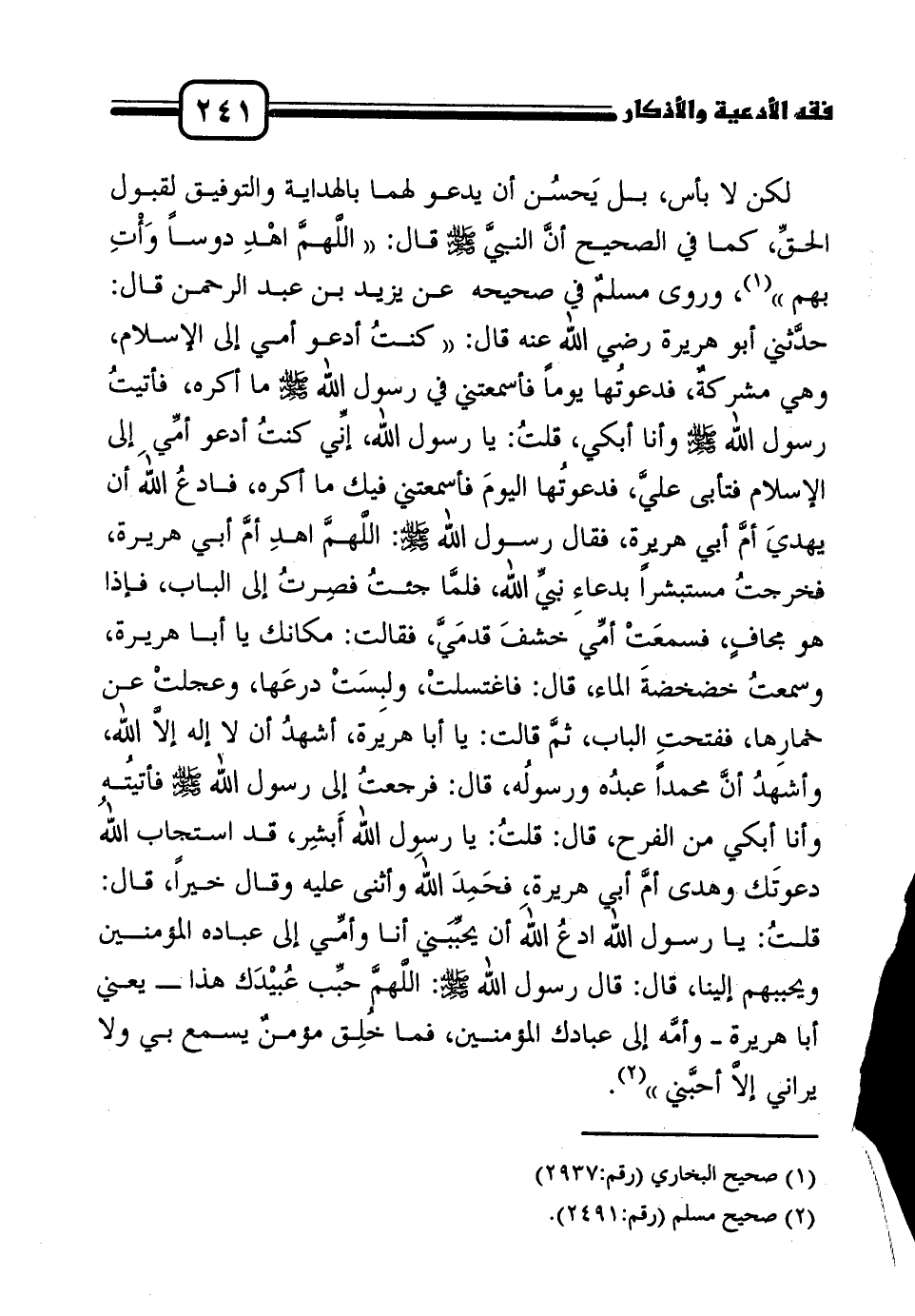 لكن لا بأس، بل يَحسُن أن يدعو لهما بالهداية والتوفيق لقبول الحقِّ، كما في الصحيح أنَّ النبيَّ صلى الله عليه وسلم قال: " اللَّهمَّ اهْدِ دوساً وَأْتِ بهم "1، وروى مسلمٌ في صحيحه عن يزيد بن عبد الرحمن قال: حدَّثني أبو هريرة رضي الله عنه قال: " كنتُ أدعو أمي إلى الإسلام، وهي مشركةٌ، فدعوتُها يوماً فأسمعتني في رسول الله صلى الله عليه وسلم ما أكره، فأتيتُ رسول الله صلى الله عليه وسلم وأنا أبكي، قلتُ: يا رسول الله، إنِّي كنتُ أدعو أمِّي إلى الإسلام فتأبى عليَّ، فدعوتُها اليومَ فأسمعتني فيك ما أكره، فادعُ اللهَ أن يهديَ أمَّ أبي هريرة، فقال رسول الله صلى الله عليه وسلم: اللَّهمَّ اهدِ أمَّ أبي هريرة، فخرجتُ مستبشراً بدعاءِ نبيِّ الله، فلمَّا جئتُ فصِرتُ إلى الباب، فإذا هو مجافٍ، فسمعَتْ أمِّي خشفَ قدمَيَّ، فقالت: مكانك يا أبا هريرة، وسمعتُ خضخضةَ الماء، قال: فاغتسلتْ، ولبِسَتْ درعَها، وعجلتْ عن خمارِها، ففتحتِ الباب، ثمَّ قالت: يا أبا هريرة، أشهدُ أن لا إله إلاَّ الله، وأشهدُ أنَّ محمداً عبدُه ورسولُه، قال: فرجعتُ إلى رسول الله صلى الله عليه وسلم فأتيتُه وأنا أبكي من الفرح، قال: قلتُ: يا رسول الله أَبشِر، قد استجاب اللهُ دعوتَك وهدى أمَّ أبي هريرة، فحَمِدَ اللهَ وأثنى عليه وقال خيراً، قال: قلتُ: يا رسول الله ادعُ اللهَ أن يحبِّبَني أنا وأمِّي إلى عباده المؤمنين ويحببهم إلينا، قال: قال رسول الله صلى الله عليه وسلم: اللَّهمَّ حبِّب عُبيْدَك هذا ـ يعني أبا هريرة ـ وأمَّه إلى عبادك المؤمنين، فما خُلِق مؤمنٌ يسمع بي ولا يراني إلاَّ أحبَّني " 2.