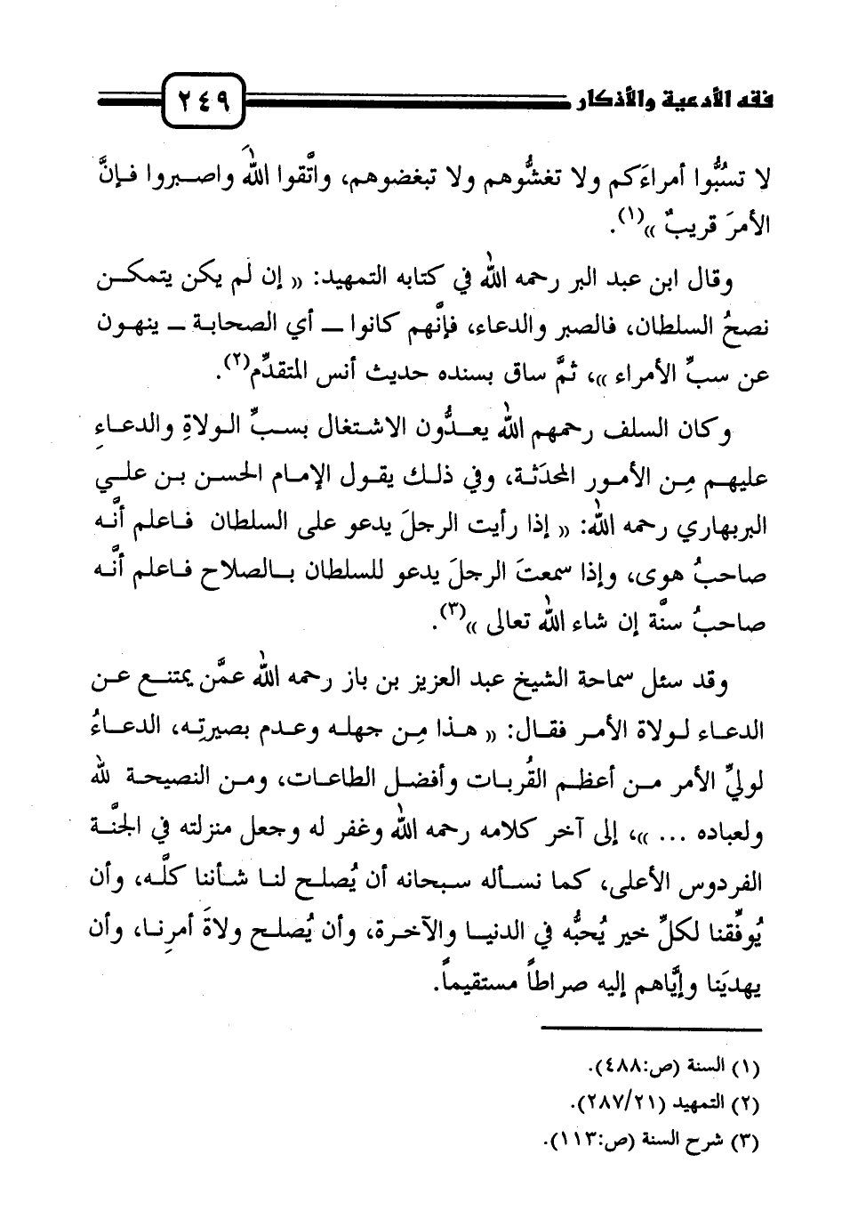 وقال ابن عبد البر رحمه الله في كتابه التمهيد: " إن لَم يكن يتمكن نصحُ السلطان، فالصبر والدعاء، فإنَّهم كانوا ـ أي الصحابة ـ ينهون عن سبِّ الأمراء "، ثمَّ ساق بسنده حديث أنس المتقدِّم2.