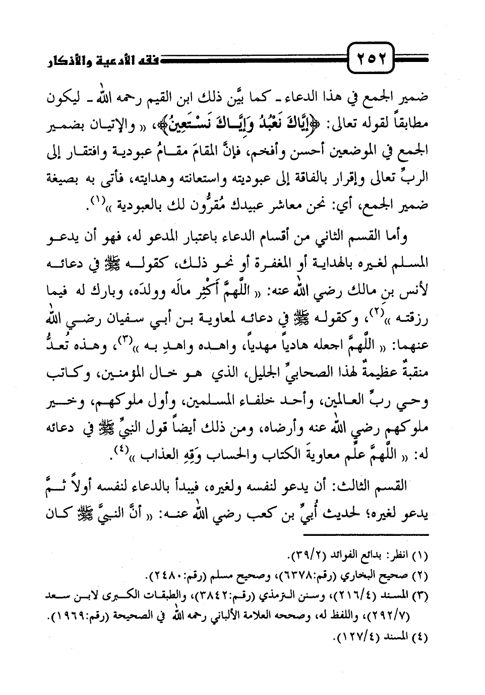 وأما القسم الثاني من أقسام الدعاء باعتبار المدعو له، فهو أن يدعو المسلم لغيره بالهداية أو المغفرة أو نحو ذلك، كقوله صلى الله عليه وسلم في دعائه لأنس بنِ مالك رضي الله عنه: " اللَّهمَّ أَكْثِر مالَه وولدَه، وبارك له فيما رزقته "2، وكقوله صلى الله عليه وسلم في دعائه لمعاوية بن أبي سفيان رضي الله عنهما: " اللَّهمَّ اجعله هادياً مهدياً، واهده واهدِ به "3، وهذه تُعدُّ منقبةٌ عظيمةٌ لهذا الصحابيِّ الجليل، الذي هو خال المؤمنين، وكاتب وحي ربِّ العالمين، وأحد خلفاء المسلمين، وأول ملوكهم، وخير ملوكهم رضي الله عنه وأرضاه، ومن ذلك أيضاً قول النبيِّ صلى الله عليه وسلم في دعائه له: " اللَّهمَّ علِّم معاويةَ الكتاب والحساب وَقِهِ العذاب "4.