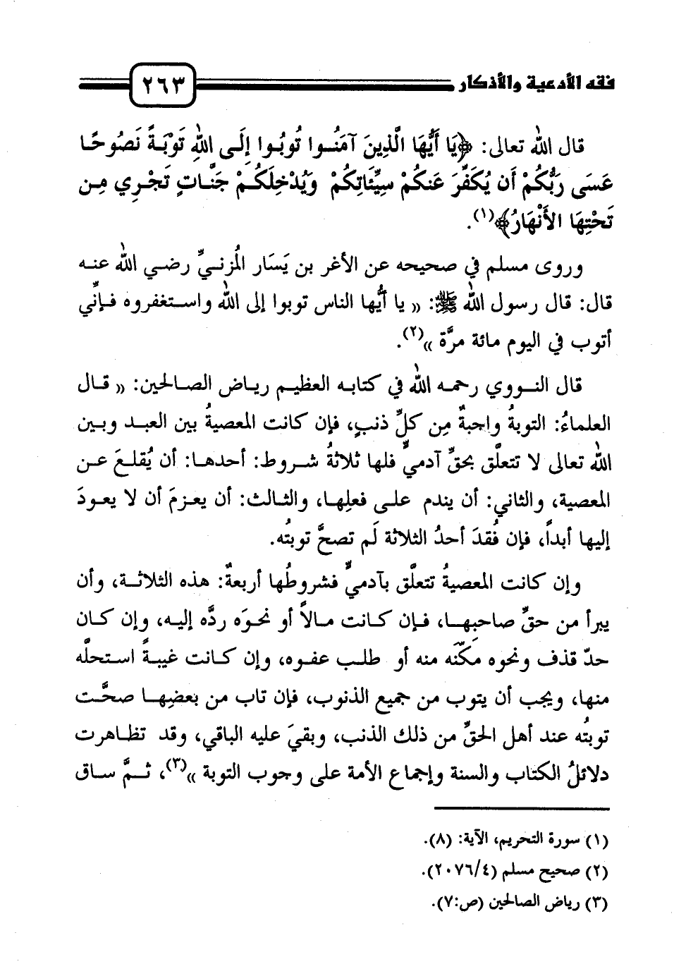قال النووي رحمه الله في كتابه العظيم رياض الصالحين: " قال العلماءُ: التوبةُ واجبةٌ مِن كلِّ ذنبٍ، فإن كانت المعصيةُ بين العبد وبين الله تعالى لا تتعلَّق بحقِّ آدميٍّ فلها ثلاثةُ شروط: أحدها: أن يُقلعَ عن المعصية، والثاني: أن يندم على فعلِها، والثالث: أن يعزمَ أن لا يعودَ إليها أبداً، فإن فُقدَ أحدُ الثلاثة لَم تصحَّ توبتُه.
