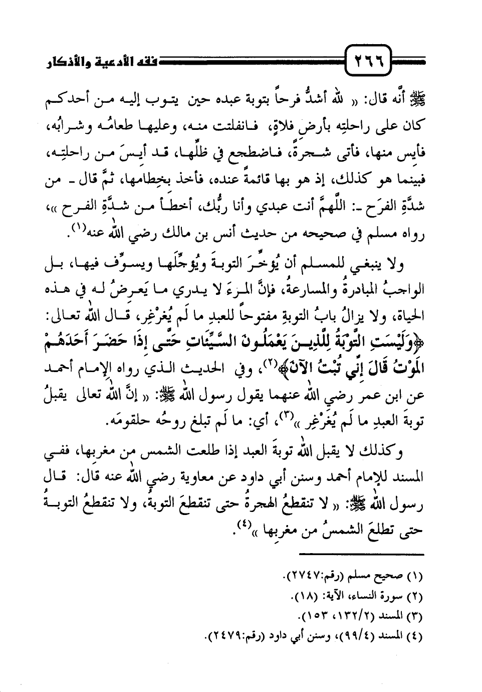صلى الله عليه وسلم أنَّه قال: " لله أشدُّ فرحاً بتوبة عبده حين يتوب إليه من أحدكم كان على راحلتِه بأرضِ فلاةٍ، فانفلتت منه، وعليها طعامُه وشرابُه، فأيِس منها، فأتى شجرةً، فاضطجع في ظلِّها، قد أيِسَ من راحلتِه، فبينما هو كذلك، إذ هو بها قائمةً عنده، فأخذ بِخِطامها، ثمَّ قال ـ من شدَّةِ الفرَح ـ: اللَّهمَّ أنت عبدي وأنا ربُّك، أخطأ من شدَّةِ الفرح "، رواه مسلم في صحيحه من حديث أنس بن مالك رضي الله عنه1.