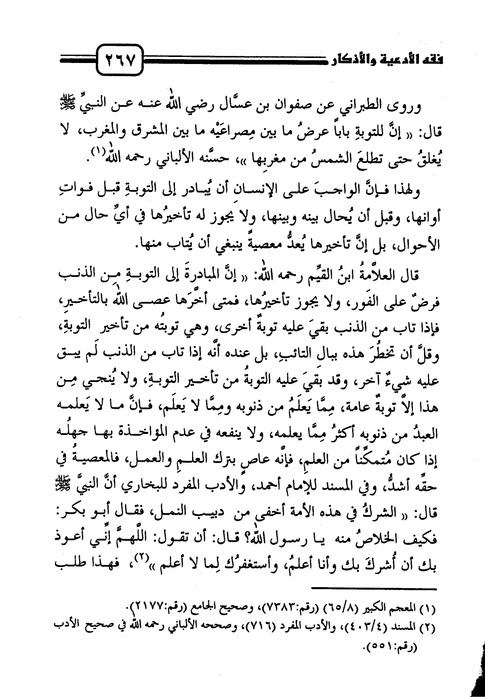 قال العلاَّمةُ ابنُ القيِّم رحمه الله: " إنَّ المبادرةَ إلى التوبةِ من الذنب فرضٌ على الفَور، ولا يجوز تأخيرُها، فمتى أخَّرَها عصى اللهَ بالتأخيرِ، فإذا تاب من الذنب بقيَ عليه توبةٌ أخرى، وهي توبتُه من تأخير التوبةِ، وقلَّ أن تخطُرَ هذه ببالِ التائبِ، بل عنده أنَّه إذا تاب من الذنب لَم يبق عليه شيءٌ آخر، وقد بقيَ عليه التوبةُ من تأخير التوبةِ، ولا يُنجي مِن هذا إلاَّ توبةٌ عامة، مِمَّا يَعلَمُ من ذنوبه ومِمَّا لا يَعلَم، فإنَّ ما لا يَعلمه العبدُ من ذنوبه أكثرُ مِمَّا يعلمه، ولا ينفعه في عدم المؤاخذة بها جهلُه إذا كان مُتمكِّناً من العلمِ، فإنَّه عاصٍ بترك العلمِ والعمل، فالمعصيةُ في حقِّه أشدُّ، وفي المسند للإمام أحمد، والأدب المفرد للبخاري أنَّ النبيَّ صلى الله عليه وسلم قال: " الشركُ في هذه الأمة أخفى من دبيب النمل، فقال أبو بكر: فكيف الخلاصُ منه يا رسول الله؟ قال: أن تقول: اللَّهمَّ إنِّي أعوذ بك أن أُشركَ بك وأنا أعلمُ، وأستغفرُك لِما لا أعلم "2، فهذا طلب