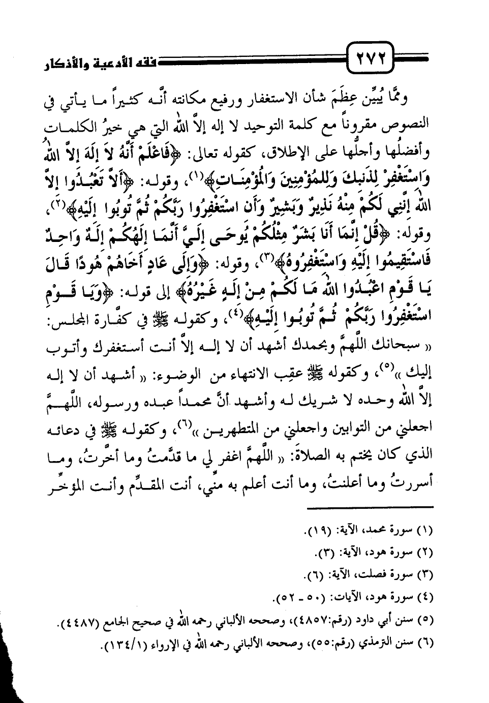 وممَّا يُبيِّن عِظَمَ شأن الاستغفار ورفيع مكانته أنَّه كثيراً ما يأتي في النصوص مقروناً مع كلمة التوحيد لا إله إلاَّ الله التي هي خيرُ الكلمات وأفضلُها وأجلُّها على الإطلاق، كقوله تعالى: {فَاعْلَمْ أَنَّهُ لاَ إِلَهَ إِلاَّ اللهُ وَاسْتَغْفِرْ لِذَنبِكَ وَلِلمُؤْمِنِينَ وَالمُؤْمِنَاتِ} 1، وقوله: {أَلاَّ تَعْبُدُوا إِلاَّ اللهَ إِنَّنِي لَكُمْ مِنْهُ نَذِيرٌ وَبَشِيرٌ وَأَنِ اسْتَغْفِرُوا رَبَّكُمْ ثُمَّ تُوبُوا إِلَيْهِ} 2، وقوله: {قُلْ إِنَّمَا أَنَا بَشَرٌ مِثْلُكُمْ يُوحَى إِلَيَّ أَنَّمَا إِلَهُكُمْ إِلَهٌ وَاحِدٌ فَاسْتَقِيمُوا إِلَيْهِ وَاسْتَغْفِرُوهُ} 3، وقوله: {وَإِلَى عَادٍ أَخَاهُمْ هُودًا قَالَ يَا قَوْمِ اعْبُدُوا اللهَ مَا لَكُمْ مِنْ إِلَهٍ غَيْرُهُ} إلى قوله: {وَيَا قَوْمِ اسْتَغْفِرُوا رَبَّكُمْ ثُمَّ تُوبُوا إِلَيْهِ} 4، وكقوله صلى الله عليه وسلم في كفَّارة المجلس: " سبحانك اللَّهمَّ وبحمدك أشهد أن لا إله إلاَّ أنت أستغفرك وأتوب إليك "5، وكقوله صلى الله عليه وسلم عقِب الانتهاء من الوضوء: " أشهد أن لا إله إلاَّ الله وحده لا شريك له وأشهد أنَّ محمداً عبده ورسوله، اللَّهمَّ اجعلني من التوابين واجعلني من المتطهرين "6، وكقوله صلى الله عليه وسلم في دعائه الذي كان يختم به الصلاةَ: " اللَّهمَّ اغفر لي ما قدَّمتُ وما أخَّرتُ، وما أسررتُ وما أعلنتُ، وما أنت أعلم به منِّي، أنت المقدِّم وأنت المؤخِّر