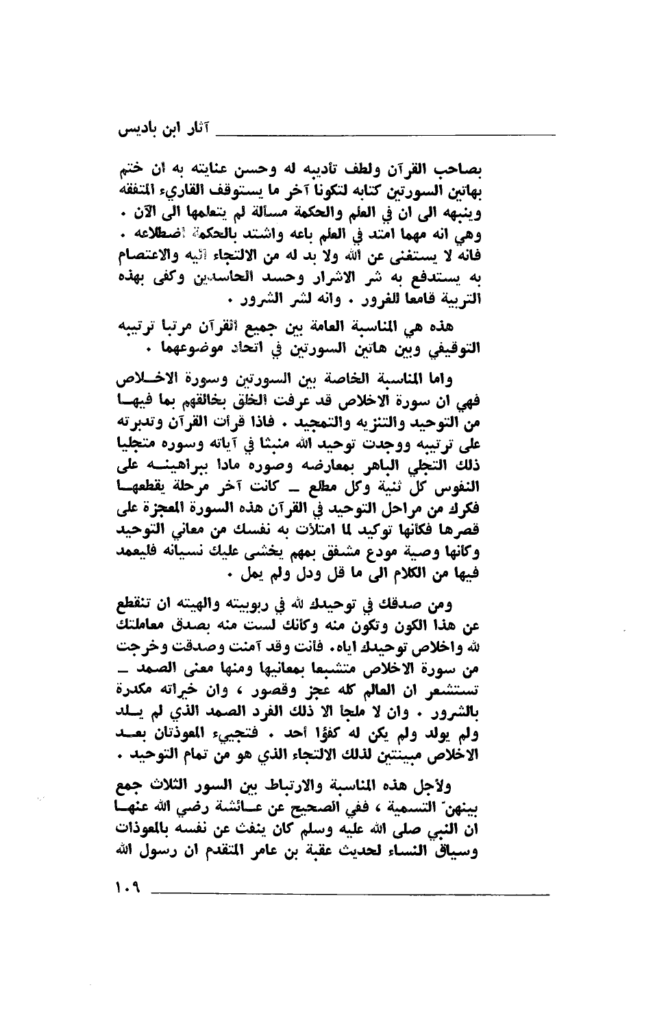 بصاحب القرآن ولطف تأديبه له، وحسن عنايته به أن ختم بهاتين السورتين كتابه لتكونا آخر ما يستوقف القاريء المتفقه، وينبهه إلى أن في العلم والحكمة مسألة لم يتعلمها إلى الآن. وهي أنه مهما امتدّ في العلم باعه واشتد بالحكمة اضطلاعه. فإنه لا يستغني عن الله ولا بد له من الالتجاء إليه والاعتصام به يستدفع به شر الأشرار وحسد الحاسدين وكفى بهذه التربية قامعًا للغرور. وإنه لشر الشرور.
