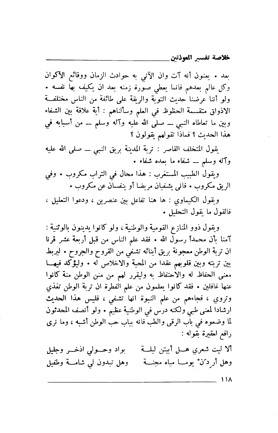 ويقول ذوو المنازع القومية والوطنية، ولو كانوا يدينون بالوثنية: آمنا بأن محمدًا رسول الله. فقد علّم الناس من قبل أربعة عشر قرنًا أن تربة الوطن معجونة بريق أبنائه تشفي من القروح والجروح. ليربط بين تربته وبين قلوبهم عقدًا من المحبة والإخلاص له. وليؤكد فيها معنى الحفاظ له والاحتفاظ به وليقرر لهم من منن الوطن منة كانوا عنها غافلين. فقد كانوا يعلمون من علم الفطرة أن تربة الوطن تُغذي وتُروي، فجاءهم من علم النبوة أنها تَشْفي، فليس هذا الحديث إرشادا لمعنى طبي ولكنه درس في الوطنية عظيم. ولو أنصف المحدثون لما وضعوه في باب الرقى والطب فإنه بباب حب الوطن أشبه، وما نرى رافع لعقيرة بقوله: