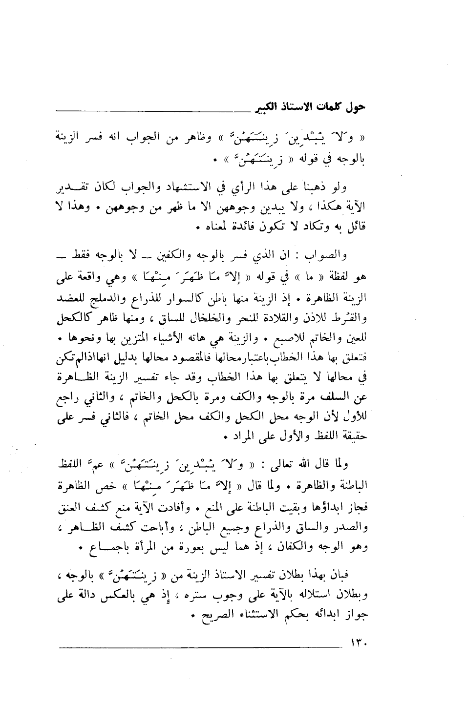 فبان بهذا بطلان تفسير الأستاذ الزينة من {زِينَتَهُنَّ} الوجه، وبطلان استدلاله بالآية على وجوب ستره، إذ هي بالعكس دالة على جواز ابدائه بحكم الاستثناء الصريح.