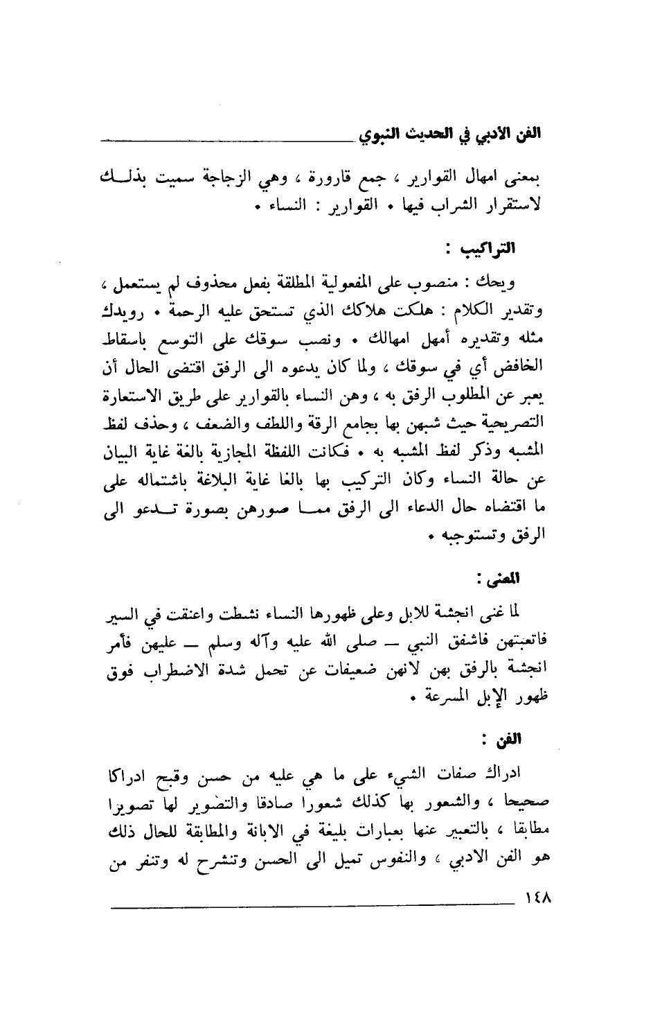 ويحك: منصوب على المفعولية المطلقة بفعل محذوف لم يستعمل، وتقدير الكلام: هلكت هلاكك الذي تستحق عليه الرحمة. رويدك مثله وتقديره أمهل امهالك. ونصب سوقك على التوسع بإسقاط الخافض أي في سوقك، ولما كان يدعوه إلى الرفق اقتضى الحال أن يعبر عن المطلوب الرفق به، وهن النساء بالقوارير على طريق الاستعارة التصريحية حيث شبهن بها بجامع الرقة واللطف والضعف، وحذف لفظ المشبه وذكر لفظ الشبه به. فكانت اللفظة المجازية بالغة غاية البيان عن حالة النساء وكان التركيب بها بالغا غاية البلاغة باشتماله على ما اقتضاه حال الدعاء إلى الرفق مما صورهن بصورة تدعو إلى الرفق وتستوجبه.
