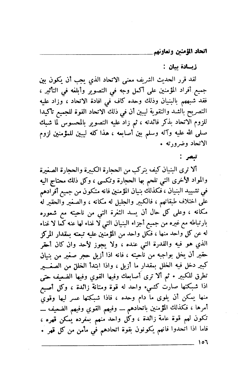 ألا ترى البنيان كيف يتركب من الحجارة الكبيرة والحجارة الصغيرة والمواد الأخرى التي تلحم بها الحجارة وتكسى، وكل ذلك محتاج اليه في تشييد البنيان، فكذلك بنيان المؤمنين فإنه متكون من جميع أفرادهم على اختلاف طبقاتهم، فالكبير والجليل له مكانه، والصغير والحقير له مكانه، وعلى كل حال أن يسد الثغرة التي من ناحيته مع شعوره بارتباطه مع غيره من جميع أجزاء البنيان التي لا غناء لها عنه كما لا غناء له عن كل واحد منها، فكل واحد من المؤمنين عليه تبعته بمقدار المركز الذي هو فيه والقدرة التي عنده، ولا يجوز لأحد وان كان أحقر حقير أن يخل بواجبه من ناحيته، فإنه إذا أزيل حجر صغير من بنيان كبير دخل فيه الخلل بمقدار ما أزيل، وإذا ابتدأ الخلل من الصغير تطرق للكبير. ثم ألا ترى أصابعك وفيها القوي وفيها الضعيف حتى إذا شبكتها صارت كشيء واحد له قوة ومتانة زائدة، وكل أصبع منها يمكن أن يلوى ما دام وحده، فإذا شبكتها عسر ليها وقوي أمرها، فكذلك المؤمنين باتحادهم- وفيهم القوي وفيهم الضعيف- تكون لهم قوة عامة زائدة، وكل واحد منهم بمفرده يمكن قهره، فأما إذا اتحدوا فإنهم يكونون بقوة اتحادهم في مأمن من كل قهر.
