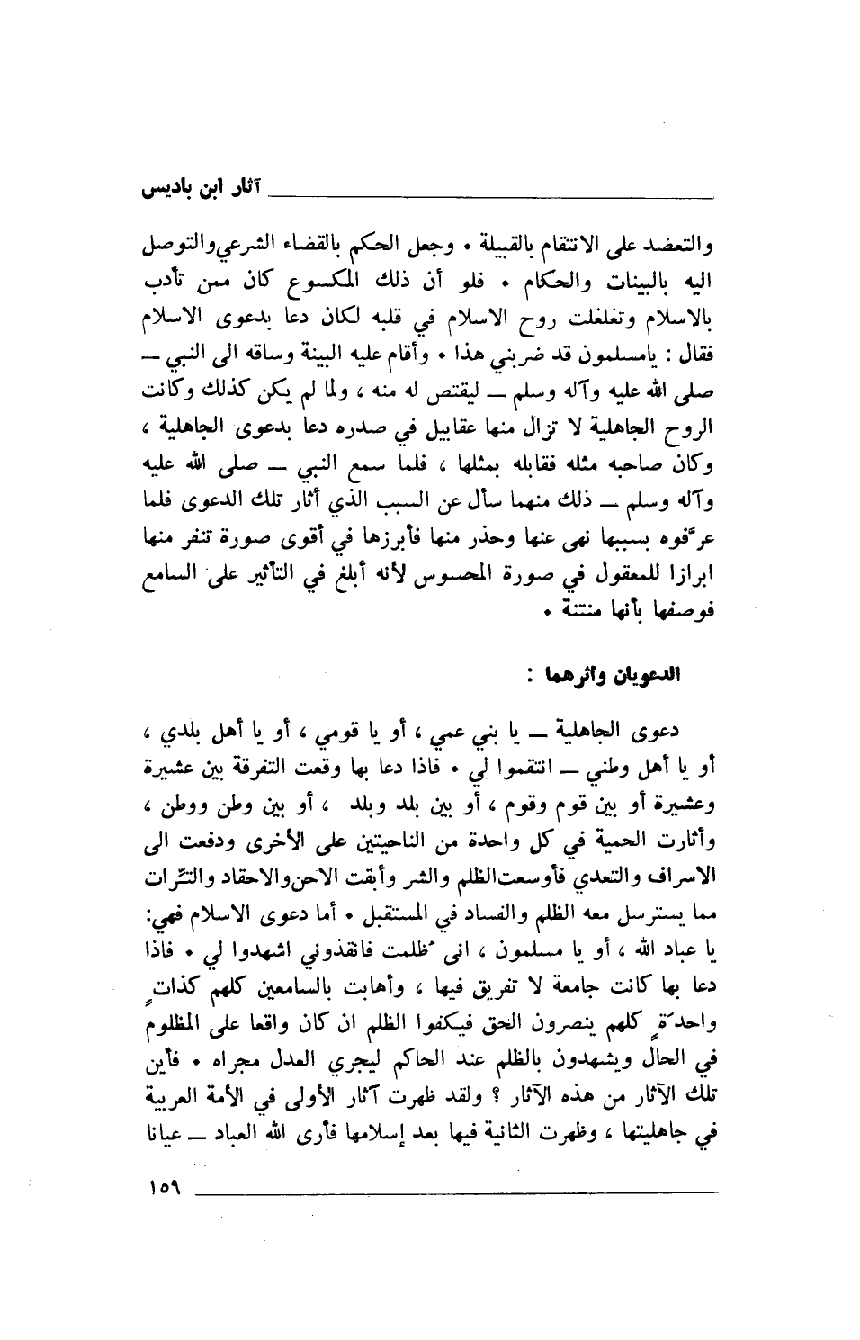 دعوى الجاهلية- يا بني عمي، أو يا قومي، أو يا أهل بلدي، أو يا أهل وطني- انتقموا لي. فإذا دعا بها وقعت التفرقة بين عشيرة وعشيرة أو بين قوم وقوم، أو بين بلد وبلد، أو بين وطن ووطن، وأثارت الحمية في كل واحدة من الناحيتين على الأخرى ودفعت إلى الإسر اف والتعدي فأوسعت الظلم والشر وأبقث الإحن والأحقاد والتّرات مما يسترسل معه الظلم والفساد في المستقبل. أما دعوى الإسلام فهي: يا عباد الله، أو يا مسلمون، إني ظُلمت فأنقذوني اشهدوا لي. فإذا دعا بها كانت جامعة لا تفريق فيها، وأهابت بالسامعين كلهم كذاتٍ واحدَةٍ كلهم ينصرون الحق فيكفوا الظلم إن كان واقعا على المظلوم في الحال ويشهدون بالظلم عند الحاكم ليجري العدل مجراه. فأين تلك الآثار من هذه الآثار؟ ولقد ظهرت آثار الأولى في الأمة العربية في جاهليتها، وظهرت الثانية فيها بعد إسلامها فأرى الله العباد- عيانا