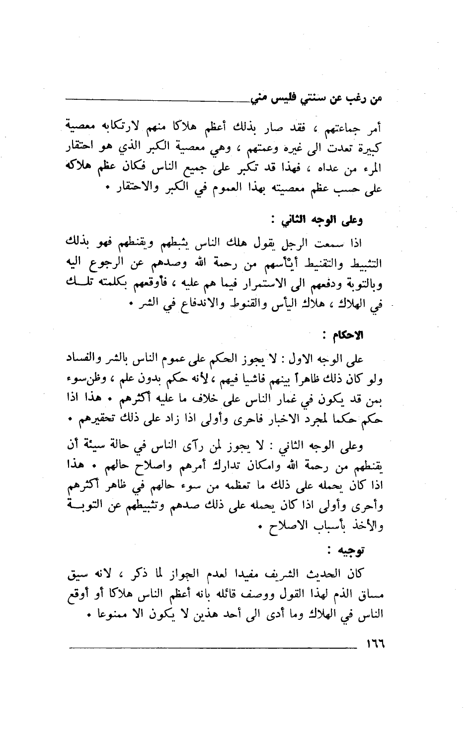 وعلى الوجه الثاني: لا يجوز لمن رآى الناس في حالة سيئة أن يقنطهم من رحمة الله وإمكان تدارك أمرهم واصلاح حالهم. هذا إذا كان يحمله على ذلك ما تعظمه من سوء حالهم في ظاهر أكثرهم وأحرى وأولى إذا كان يحمله على ذلك صدهم وتثبيطهم عن التوبة والأخذ بأسباب الإصلاح.
