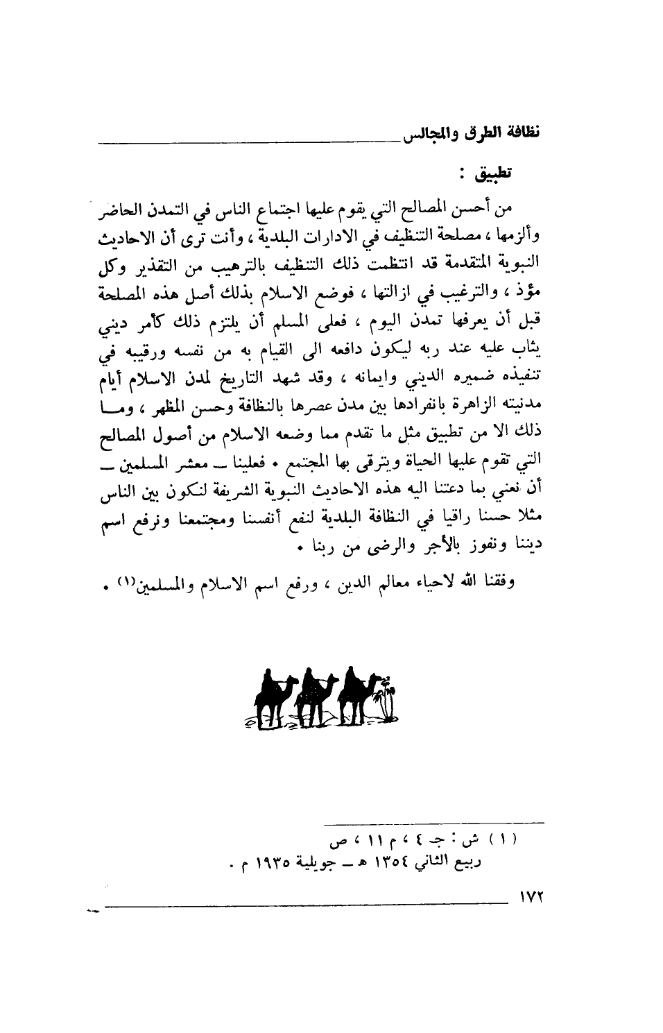 من أحسن المصالح التي يقوم عليها اجتماع الناس في التمدن الحاضر وألزمها، مصلحة التنظيف في الإدارات البلدية، وأنت ترى أن الأحاديث النبوية المتقدمة قد انتظمت ذلك التنظيف بالترهيب من التقذير وكل مؤذ، والترغيب في إزالتها، فوضع الإسلام بذلك أصل هذه المصلحة قبل أن يعرفها تمدن اليوم، فعلى المسلم أن يلتزم ذلك كأمر ديني يثاب عليه عند ربه ليكون دافعه إلى القيام به من نفسه ورقيبه في تنفيذه ضميره الديني وإيمانه، وقد شهد التاريخ لمدن الإسلام أيام مدنيته الزاهرة بانفرادها بين مدن عصرها النظافة وحسن المظهر، وما ذلك إلا من تطبيق مثل ما تقدم مما وضعه الإسلام من أصول المصالح التي تقوم عليها الحياة ويترقى بها المجتمع. فعلينا- معشر المسلمين- أن نعني بما دعتنا إليه هذه الأحاديث النبوية الشريفة لنكون بين الناس مثلا حسنا راقيا في النظافة البلدية لنفع أنفسنا ومجتمعنا ونرفع اسم ديننا ونفوز بالأجر والرضى من ربنا.