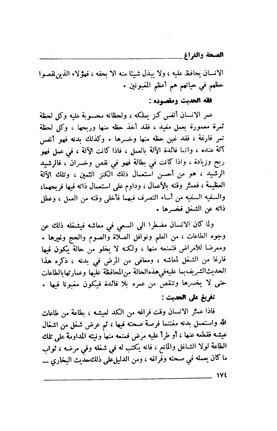 فإذا عمَّر الإنسان وقت فراغه من الكد لعيشه، بطاعة من طاعات الله واستعمل بدنه مغتنما فرصة صحته فيها، ثم عرض شغل من اشغال عيشه فقطعه عنها، او طرأ عليه مرض فمنعه منها ونيته المداومة على تلك الطاعة لولا الشاغل والمانع، فإنه يكتب له في شغله وفي مرضه، ثواب ما كان يعمله في صحته وفراغه، ومن الدليل على ذلك حديث البخاري-