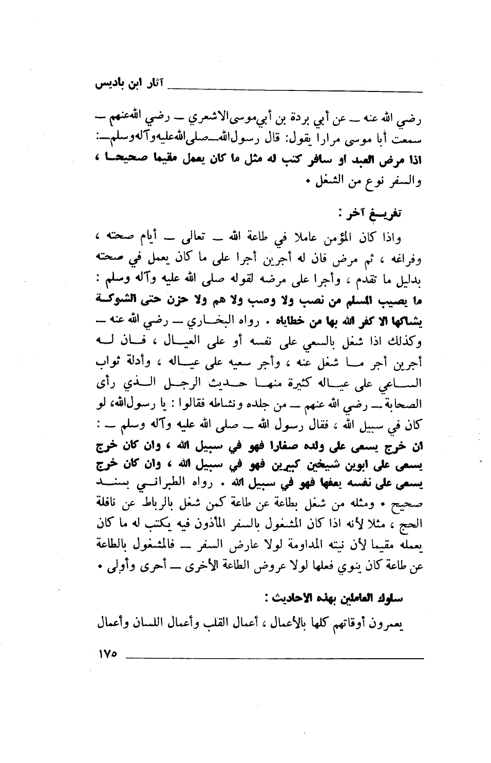رضي الله عنه- عن أبي بردة بن أبي موسى الأشعري- رضي الله عنهم- سمعت أبا موسى مرارا يقول: قال رسول الله- صلى الله عليه وآله وسلم-: إذا مرض العبد أو سافر كتب له مثل ما كان يعمل مقيما صحيحا، والسفر نوع من الشغل.