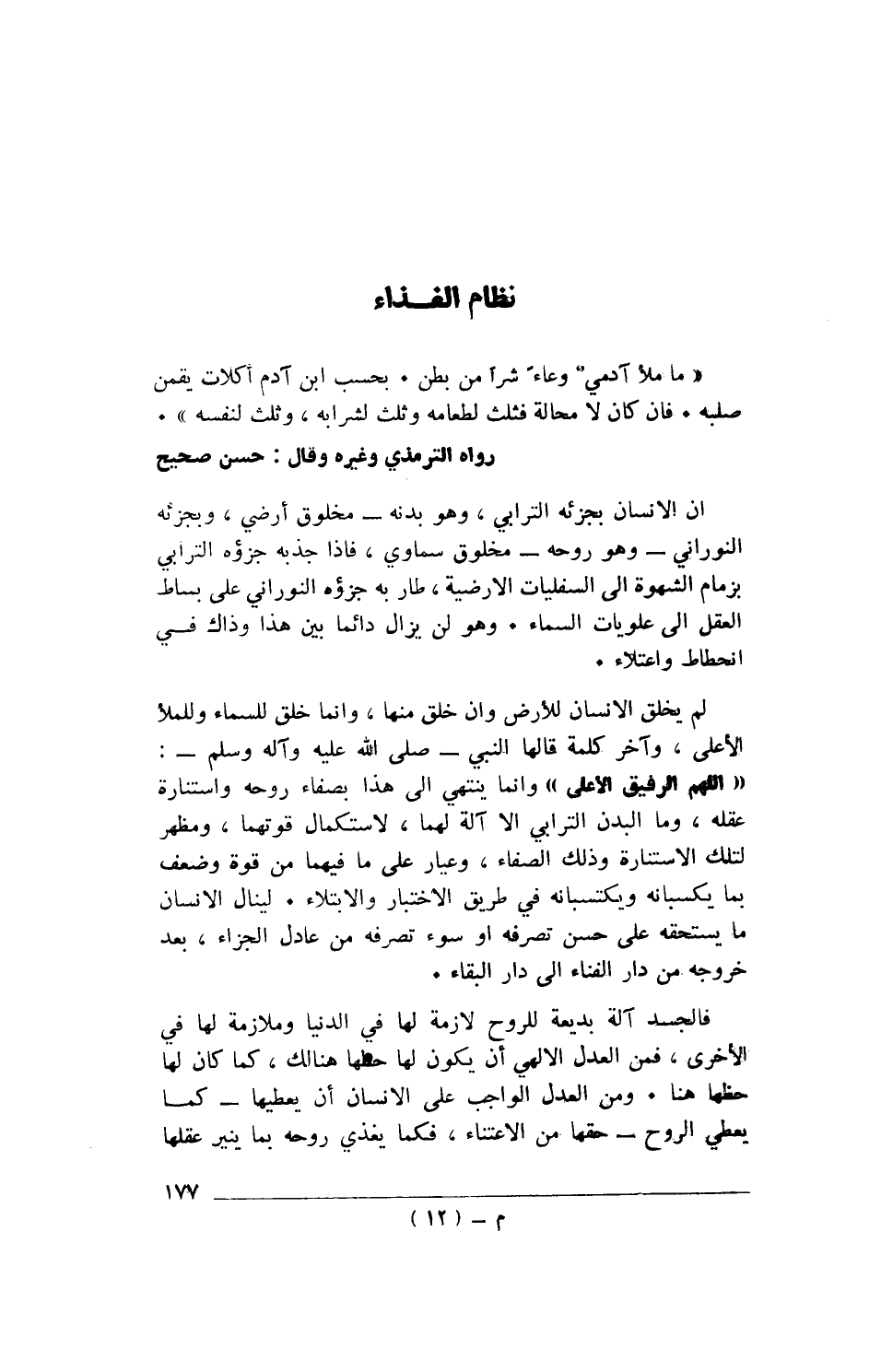 «مَا مَلَأَ آدَمِيٌّ وِعَاءً شَرًّا مِنْ بَطْنٍ. بِحَسْبِ ابْنِ آدَمَ أُكُلَاتٌ يُقِمْنَ صُلْبَهُ. فَإِنْ كَانَ لَا مَحَالَةَ فَثُلُثٌ لِطَعَامِهِ وَثُلُثٌ لِشَرَابِهِ، وَثُلُثٌ لِنَفَسِهِ». رواه الترمذي وغيره وقال: حسن صحيح