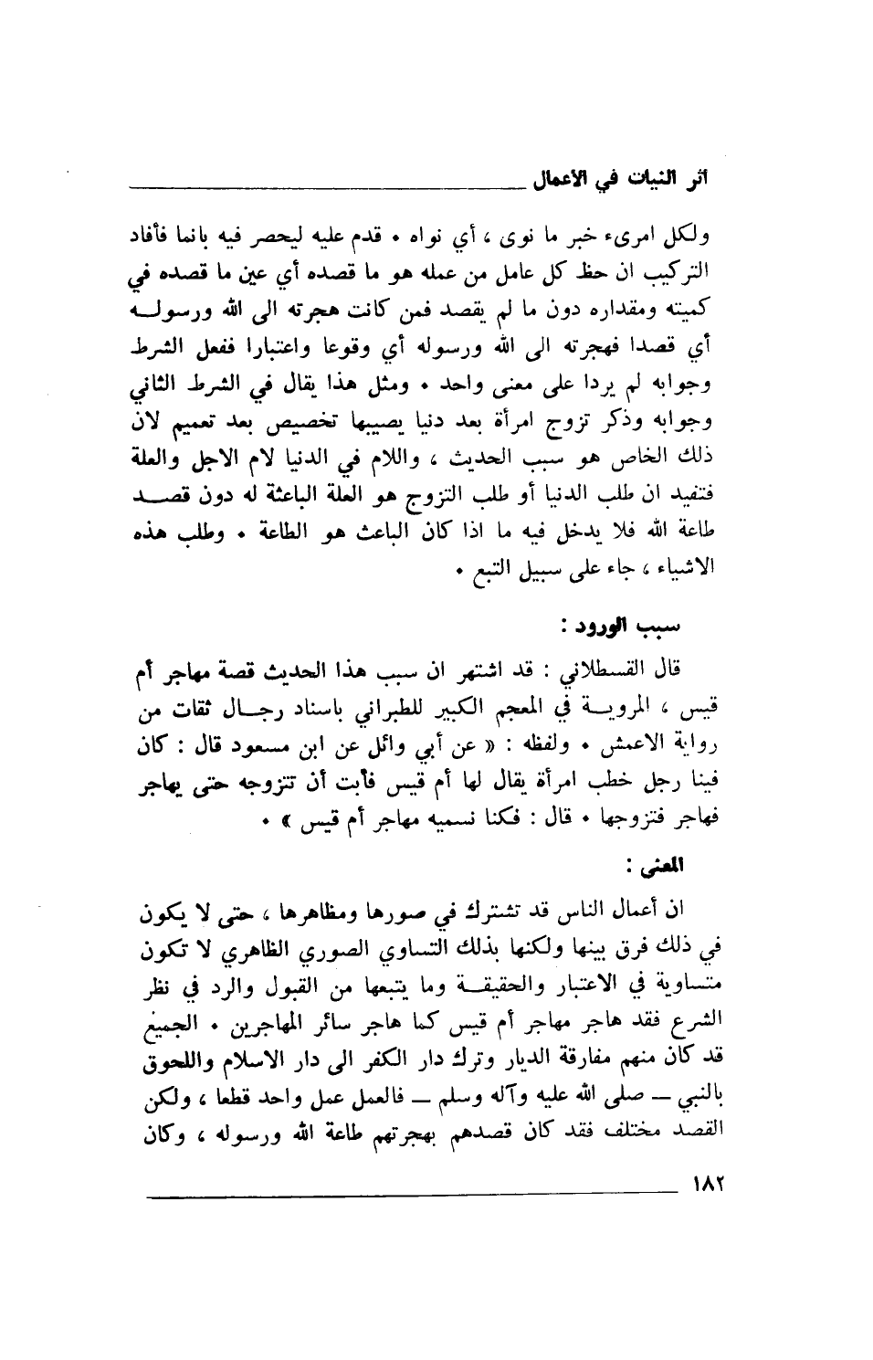 إن أعمال الناس قد تشترك في صورها ومظاهرها، حتى لا يكون في ذلك فرق بينها ولكنها بذلك التساوي الصوري الظاهري لا تكون متساوية في الاعتبار والحقيقة وما يتبعها من القبول والرد في نظر الشرع فقد هاجر مهاجر أم قيس كما هاجر سائر المهاجرين. الجميع قد كان منهم مفارقة الديار وترك دار الكفر إلى دار الإسلام واللحوق بالنبي- صلى الله عليه وآله وسلم- فالعمل عمل واحد قطعا، ولكن القصد مختلف فقد كان قصدهم بهجرتهم طاعة الله ورسوله، وكان