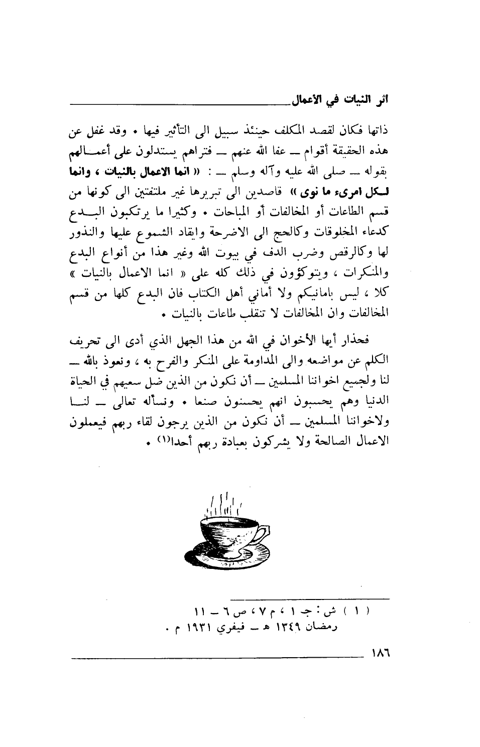 ذاتها فكان لقصد المكلف حينئذ سبيل إلى التأثير فيها. وقد غفل عن هذه الحقيقة أقوام- عفا الله عنهم- فتراهم يستدلون على أعمالهم بقوله - صلى الله عليه وآله وسلم-: «إنما الأعمال بالنيات، وإنما لكل امرىء ما نوى» قاصدين إلى تبريرها غير ملتفتين إلى كونها من قسم الطاعات أو المخالفات أو المباحات. وكثيرا ما يرتكبون البدع كدعاء المخلوقات وكالحج إلى الأضرحة وإيقاد الشموع عليها والنذور لها وكالرقص وضرب الدف في بيوت الله وغير هذا من أنواع البدع والمنكرات، ويتوكؤون في ذلك كله على «إنما الأعمال بالنيات» كلا، ليس بأمانيكم ولا أماني أهل الكتاب فإن البدع كلها من قسم المخالفات وأن المخالفات لا تنقلب طاعات بالنيات.