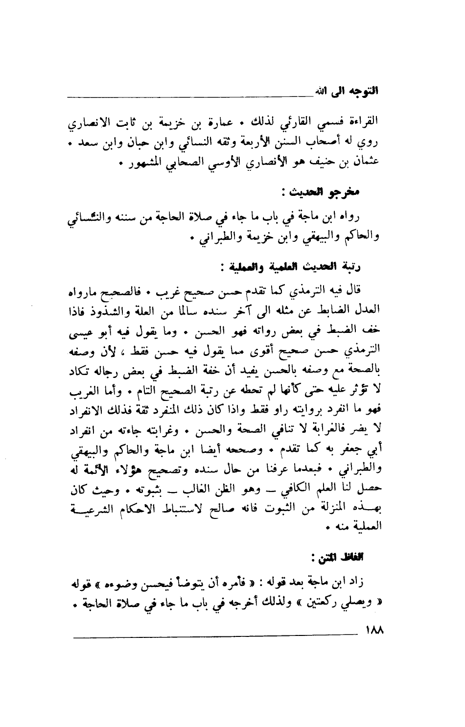 القراءة فسمي القارئي لذلك. عمارة بن خزيمة بن ثابت الانصاري روي له أصحاب السنن الأربعة وثقه النسائي وابن حبان وابن سعد. عثمان بن حنيف هو الأنصاري الأوسي الصحابي المشهور.