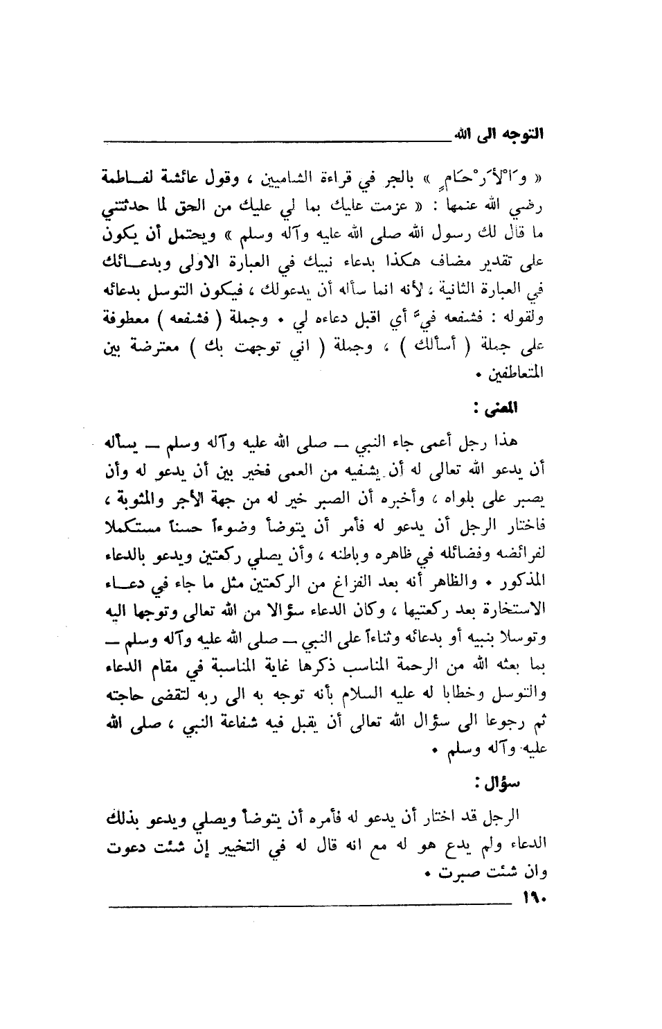 هذا رجل أعمى جاء النبي- صلى الله عليه وآله وسلم- يسأله أن يدعو الله تعالى له أن يشفيه من العمى فخير بين أن يدعو له وأن يصبر على بلواه، وأخبره أن الصبر خير له من جهة الأجر والمثوبة، فاختار الرجل أن يدعو له فأمر أن يتوضأ وضوءاً حسنا مستكملا لفرائضه وفضائله في ظاهره وباطنه، وأن يصلي ركعتين ويدعو بالدعاء المذكور. والظاهر أنه بعد الفراغ من الركعتين مثل ما جاء في دعاء الاستخارة بعد ركعتيها، وكان الدعاء سؤالا من الله تعالى وتوجها إليه وتوسلا بنبيه أو بدعائه وثناءاً على النبي- صلى الله عليه وآله وسلم- بما بعثه الله من الرحمة المناسب ذكرها غاية المناسبة في مقام الدعاء والتوسل وخطابا له عليه السلام بأنه توجه به إلى ربه لتقضى حاجته ثم رجوعا إلى سؤال الله تعالى أن يقبل فيه شفاعة النبي، صلى الله عليه وآله وسلم.