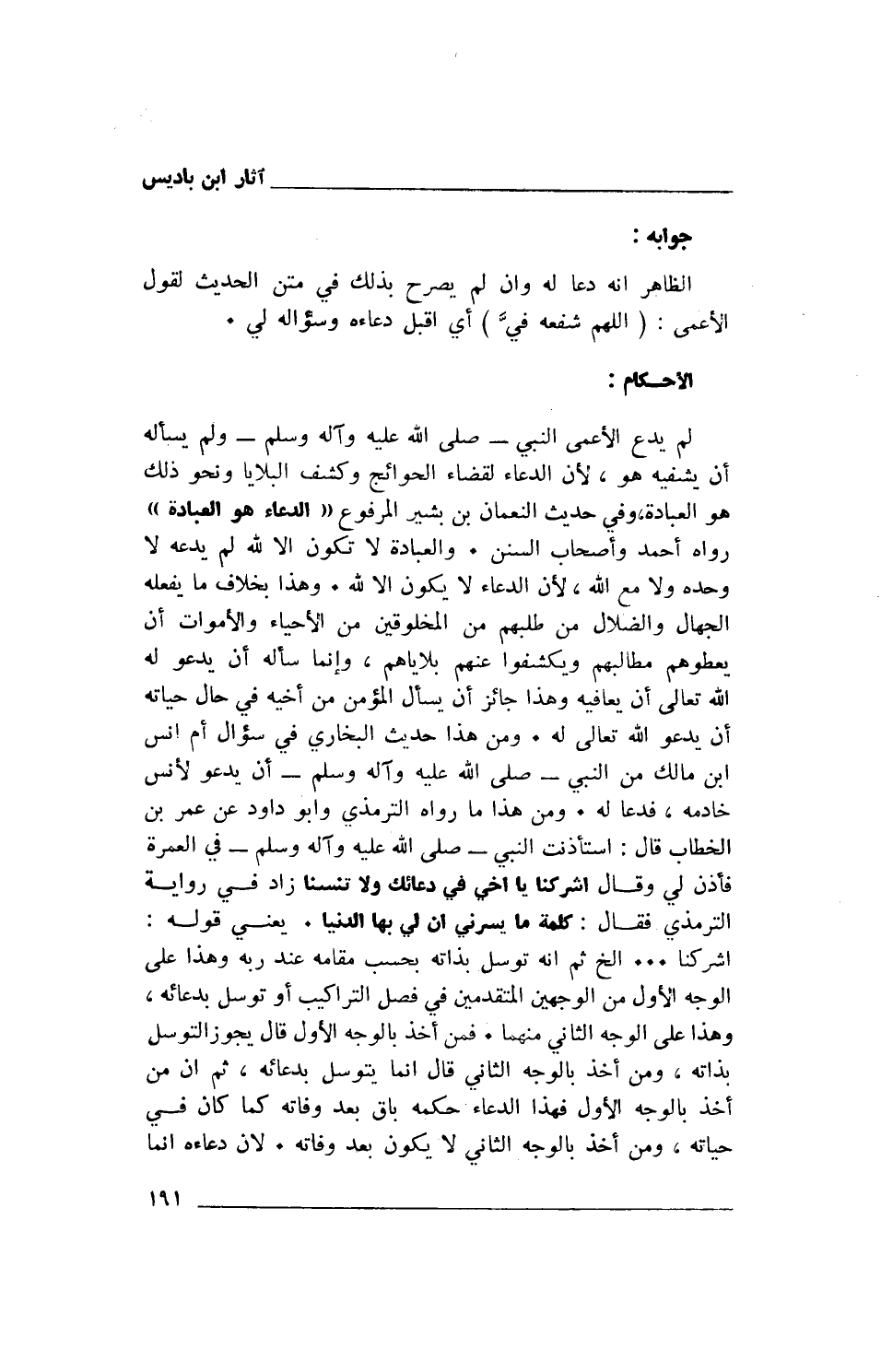 لم يدع الأعمى النبي- صلى الله عليه وآله وسلم- ولم يسأله أن يشفيه هو، لأن الدعاء لقضاء الحوائج وكشف البلايا ونجو ذلك هو العبادة، وفي حديث النعمان بن بشير المرفوع «الدُّعاءُ هوَ العِبَادةُ» رواه أحمد وأصحاب السنن. والعبادة لا تكون إلا لله لم يدعه لا وحده ولا مع الله، لأن الدعاء لا يكون إلا لله. وهذا بخلاف ما يفعله الجهال والضلال من طلبهم من المخلوقين من الأحياء والأموات أن يعطوهم مطالبهم ويكشفوا عنهم بلاياهم، وإنما سأله أن يدعو له الله تعالى أن يعافيه وهذا جائز أن يسأل المؤمن من أخيه في حال حياته أن يدعو الله تعالى له. ومن هذا حديث البخاري في سؤال أم أنس ابن مالك من النبي- صلى الله عليه وآله وسلم- أن يدعو لأنس خادمه، فدعا له. ومن هذا ما رواه الترمذي وأبو داود عن عمر بن الخطاب قال: استأذنت النبي- صلى الله عليه وآله وسلم- في العمرة فأذن لي وقال اشركنا يا أخي في دعائك ولا تنسنا زاد في رواية الترمذي فقال: كلمة ما يسرني أن لي بها الدنيا. يعني قوله: أشركنا ... الخ ثم انه توسل بذاته بحسب مقامه عند ربه وهذا على الوجه الأول من الوجهين المتقدمين في فصل التراكيب أو توسل بدعائه، وهذا على الوجه الثاني منهما. فمن أخذ بالوجه الأول قال يجوز التوسل بذاته، ومن أخذ بالوجه الثاني قال إنما يتوسل بدعائه، ثم ان من أخذ بالوجه الأول فهذا الدعاء حكمه باق بعد وفاته كما كان في حياته، ومن أخذ بالوجه الثاني لا يكون بعد وفاته. لأن دعاءه إنما