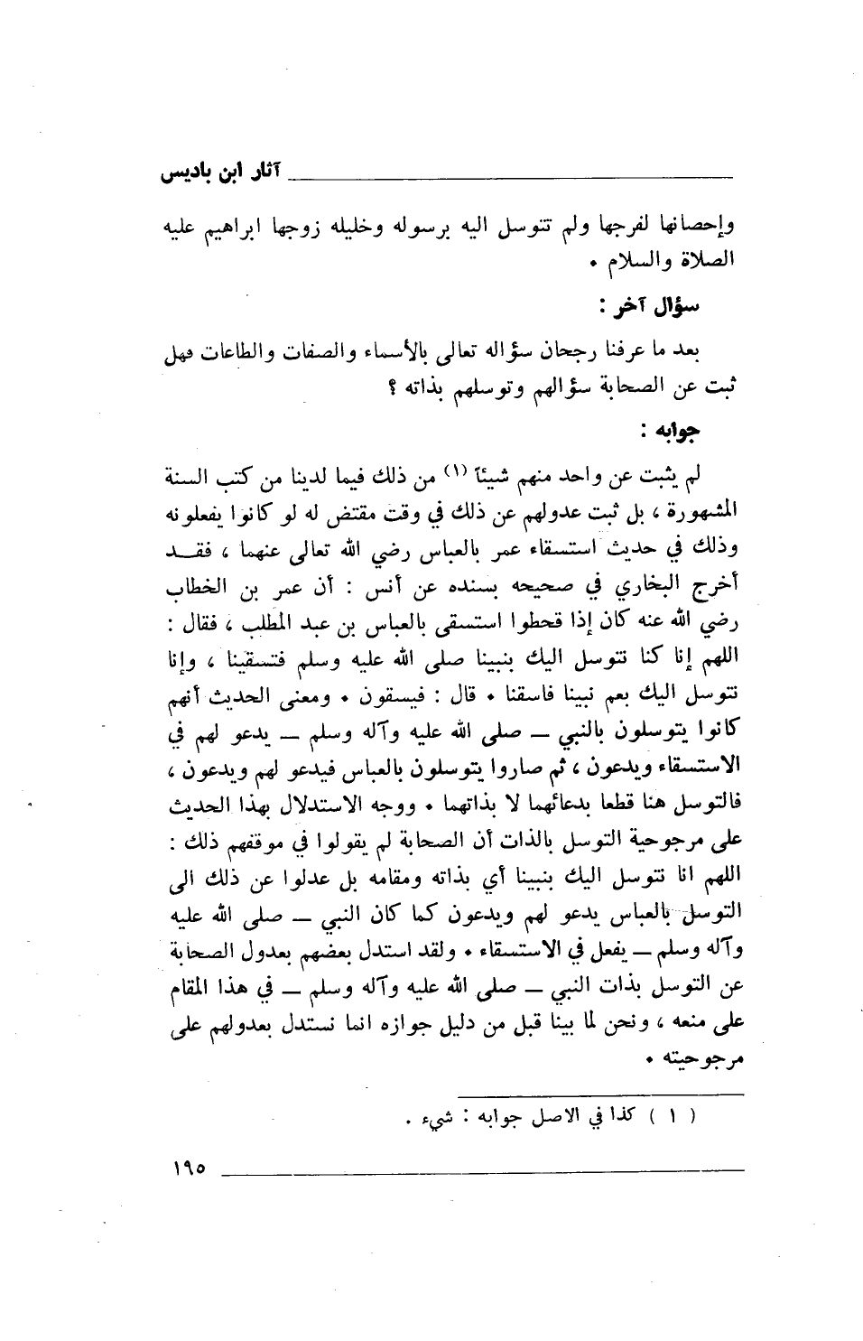 لم يثبت عن واحد منهم شيئا (1) من ذلك فيما لدينا من كتب السنة المشهورة، بل ثبت عدولهم عن ذلك في وقت مقتض له لو كانوا يفعلونه وذلك في حديث استسقاء عمر بالعباس رضي الله تعالى عنهما، فقد أخرج البخاري في صحيحه بسنده عن أنس: أن عمر بن الخطاب رضي الله عنه كان إذا قحطوا استسقى بالعباس بن عبد المطلب، فقال: اللهم إنا كنا نتوسل إليك بنبينا صلى الله عليه وسلم فتسقينا، وإنا نتوسل إليك بعم نبينا فاسقنا. قال: فيسقون. ومعنى الحديث أنهم كانوا يتوسلون بالنبي- صلى الله عليه وآله وسلم- يدعو لهم في الاستسقاء ويودعون، ثم صاروا يتوسلون بالعباس فيدعو لهم ويدعون، فالتوسل هنا قطعا بدعائهما لا بذاتهما. ووجه الاستدلال بهذا الحديث على مرجوحية التوسل بالذات أن الصحابة لم يقولوا في موقفهم ذلك: اللهم إنا نتوسل إليك بنبينا أي بذاته ومقامه بل عدلوا عن ذلك إلى التوسل بالعباس يدعو لهم ويدعون كما كان النبي- صلى الله عليه وآله وسلم- يفعل في الاستسقاء. ولقد استدل بعضهم بعدول الصحابة عن التوسل بذات النبي- صلى الله عليه وآله وسلم- في هذا المقام على منعه، ونحن لما بينا قبل من دليل جوازه إنما نستدل بعدولهم على مرجوحيته.