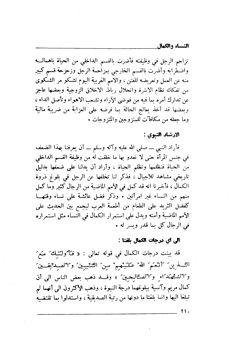 فأراد النبي- صلى الله عليه وآله وسلم- أن يعرفنا بهذا الضعف في جنس المرأة حتى لا نعدو بها ما خلقت له من وظيفة القسم الداخلي من الحياة فنظلمها ونظلم الحياة، وأراد أن يدلنا على ضعفها بدليل تاريخي مشاهد للأجيال، فذكر لنا تخلفها عن الرجل في بلوغ ذروة الكمال، فأخبرنا أنه قد كمل في الأمم الماضية من الرجال كثير وما كمل منهم من النساء غير امرأتين. وذكر فضل عائشة على نساء وقتها كفضل الثريد على الطعام من أطعمة العرب ليجمع بين الحديث على الأمم الماضية وأمته ويدل على استمرار الكمال في النساء مثل استمراره في الرجال كل بما قدر ويسر له.