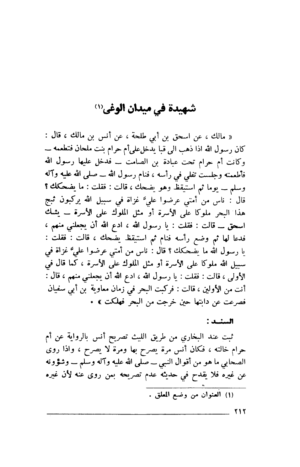 ((مَالِك، عَنْ إِسْحَقَ بْنِ أَبِي طَلْحَةَ، عَنْ أَنَسِ بْنِ مَالِكٍ، قَالَ كَانَ رَسُولُ اللَّهِ إِذَا ذَهَبَ إِلَى قُبَا يَدْخُلُ عَلَى أُمِّ حَرَامٍ بِنْتِ مِلْحَانَ فَتُطْعِمُهُ -وَكَانَتْ أُمُّ حَرَامٍ تَحْتَ عُبَادَةَ بْنِ الصَّامِتِ- فَدَخَلَ عَلَيْهَا رَسُولُ اللَّهِ فَأَطْعَمَتْهُ وَجَلَسَتْ تَفْلِي فِي رَأْسِهِ، فَنَامَ رَسُولُ اللَّهِ -صَلَّى اللَّهُ عَلَيْهِ وَآلِهِ وَسَلَّمَ- يَوْمًا ثُمَّ اسْتَيْقَظَ وَهُوَ يَضْحَكُ، قَالَتْ: فَقُلْتُ: مَا يُضْحِكُكَ؟ قَالَ: نَاسٌ مِنْ أُمَّتِي عُرِضُوا عَلَيَّ غُزَاةً فِي سَبِيلِ اللَّهِ يَرْكَبُونَ ثَبَجَ هَذَا الْبَحْرِ مُلُوكًا عَلَى الْأَسِرَّةِ أَوْ مِثْلَ الْمُلُوكِ عَلَى الْأَسِرَّةِ -يَشُكُّ إِسْحَقُ- قَالَتْ: فَقُلْتُ: يَا رَسُولَ اللَّهِ، ادْعُ اللَّهَ أَنْ يَجْعَلَنِي مِنْهُمْ، فَدَعَا لَهَا ثُمَّ وَضَعَ رَأْسَهُ فَنَامَ ثُمَّ اسْتَيْقَظَ يَضْحَكُ، قَالَتْ: فَقُلْتُ: يَا رَسُولَ اللَّهِ مَا يُضْحِكُكَ؟ قَالَ: نَاسٌ مِنْ أُمَّتِي عُرِضُوا عَلَيَّ غُزَاةً فِي سَبِيلِ اللَّهِ مُلُوكًا عَلَى الْأَسِرَّةِ أَوْ مِثْلَ الْمُلُوكِ عَلَى الْأَسِرَّةِ، كَمَا قَالَ فِي الْأُولَى، قَالَتْ: فَقُلْتُ: يَا رَسُولَ اللَّهِ، ادْعُ اللَّهَ أَنْ يَجْعَلَنِي مِنْهُمْ، فَقَالَ: أَنْتِ مِنْ الْأَوَّلِينَ، قَالَتْ: فَرَكِبَتْ الْبَحْرَ فِي زَمَانِ مُعَاوِيَةَ بن أبي سفيان فَصُرِعَتْ عَنْ دَابَّتِهَا حِينَ خَرَجَتْ مِنْ الْبَحْرِ فَهَلَكَتْ)).