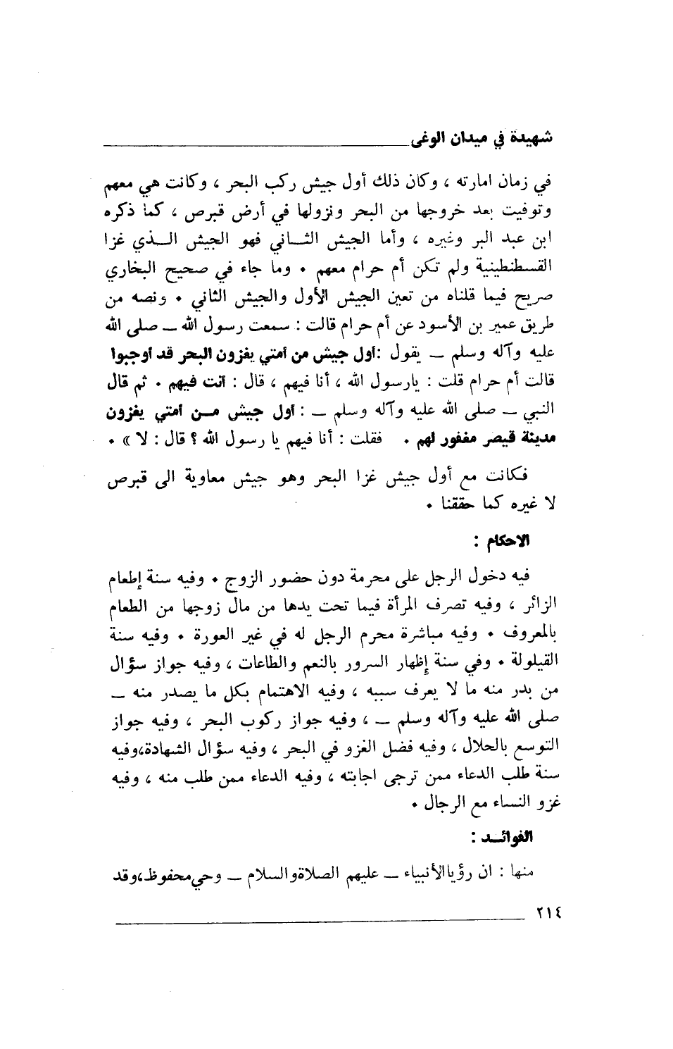 في زمان إمارته، وكان ذلك أول جيش ركب البحر، وكانت هي معهم وتوفيت بعد خروجها من البحر ونزولها في أرض قبرص، كما ذكره ابن عبد البر وغيره، وأما الجيش الثاني فهو الجيش الذي غزا القسطنطينية ولم تكن أم حرام معهم. وما جاء في صحيح البخاري صريح فيما قلناه من تعين الجيش الأول والجيش الثاني. ونصه من طريق عمير بن الأسود عن أم حرام قالت: سمعت رسول الله- صلى الله عليه وآله وسلم- يقول: أول جيش من أمتي يغزون البحر قد أوجبوا قالت أم حرام قلت: يا رسول الله، أنا فيهم، قال: أنت فيهم. ثم قال النبي- صلى الله عليه وآله وسلم-: أول جيش من أمتي يغزون مدينة قيصر مغفور لهم. فقلت: أنا فيهم يا رسول الله؟ قال: لا.