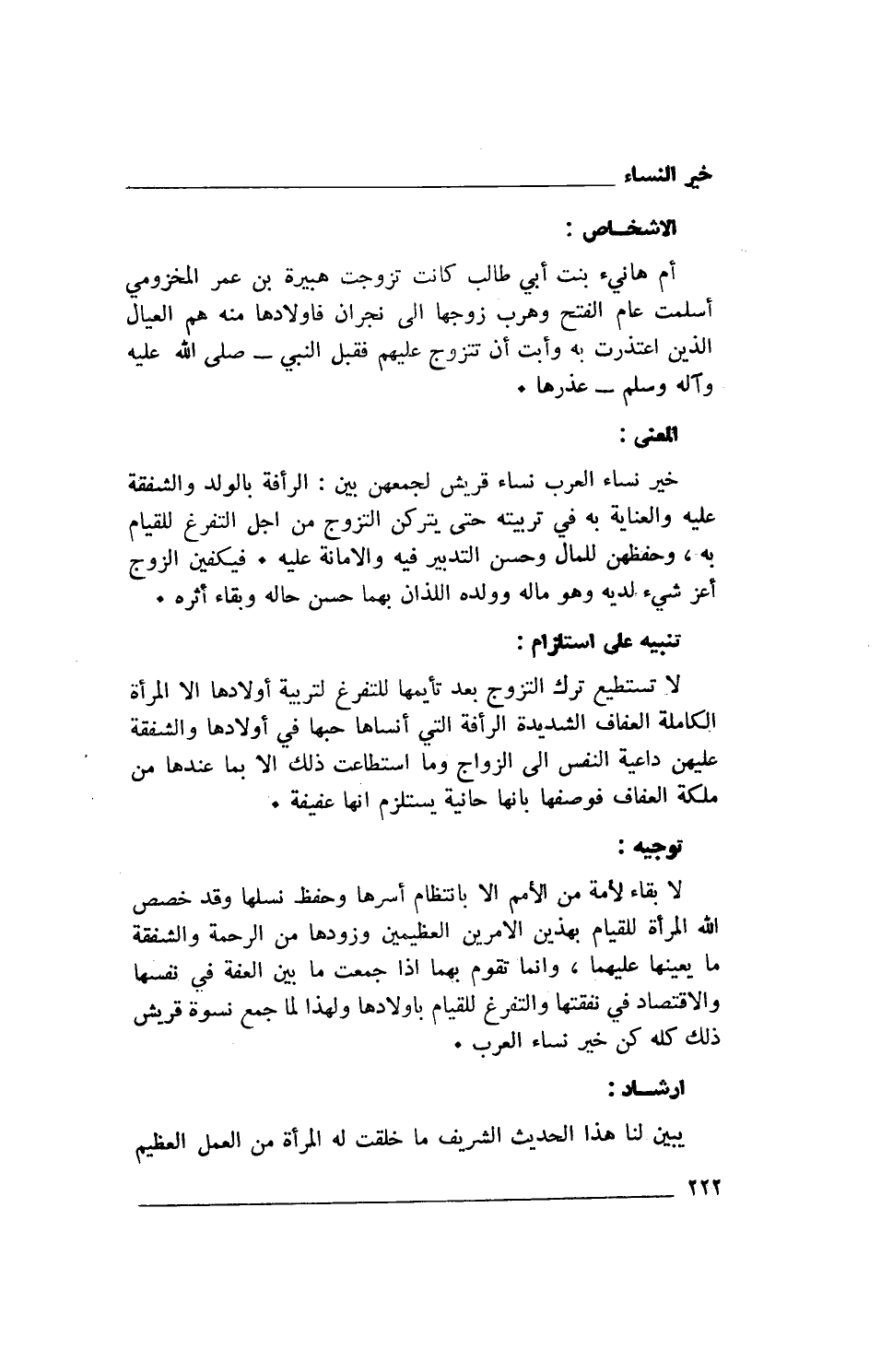 خير نساء العرب نساء قريش لجمعهن بين: الرأفة بالولد والشفقة عليه والعناية به في تربيته حتى يتركن التزوج من أجل التفرغ للقيام به، وحفظهن للمال وحسن التدبير فيه والأمانة عليه. فيكفين الزوج أعز شيء لديه وهو ماله وولده اللذان بهما حسن حاله وبقاء أثره.