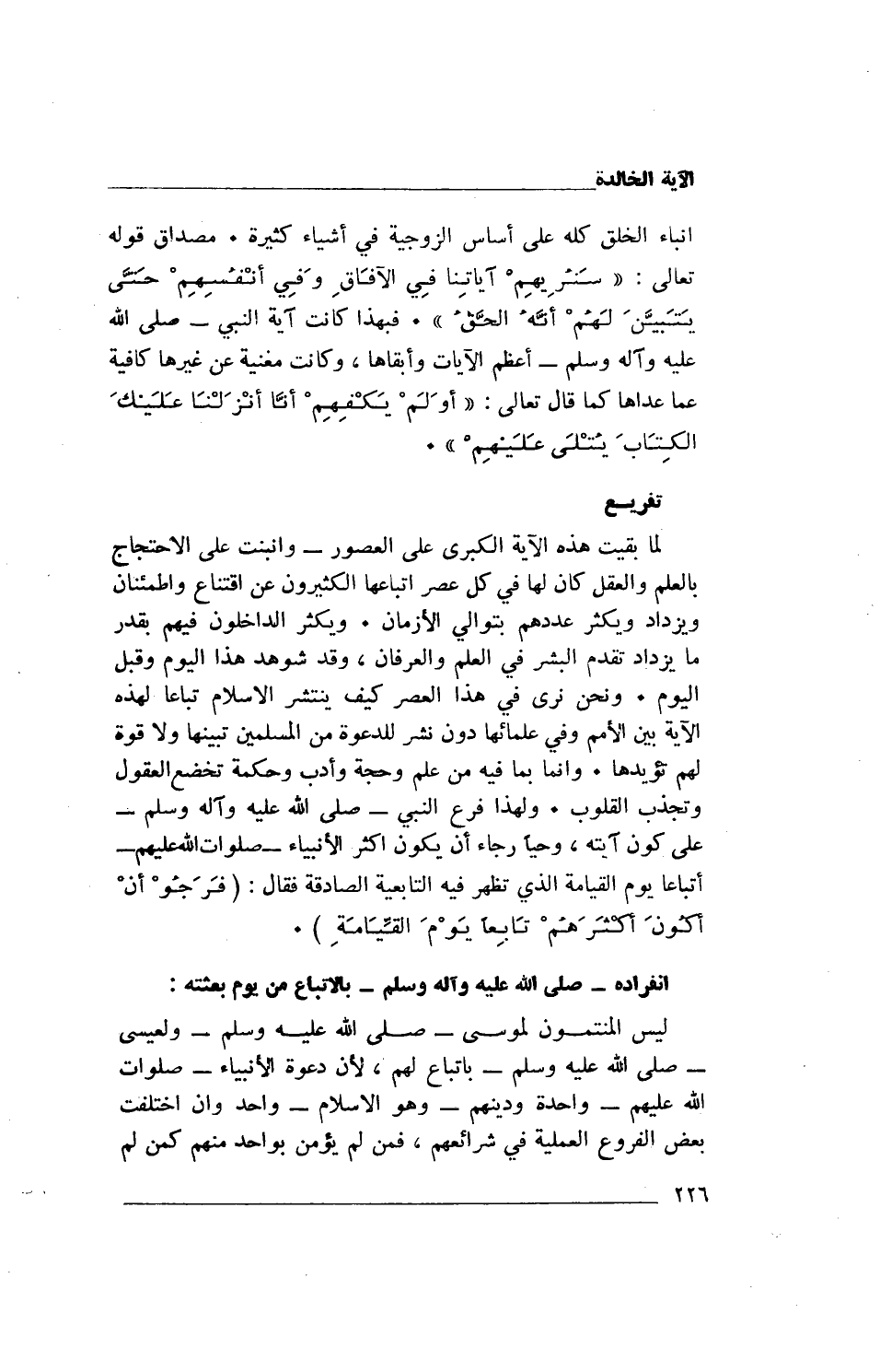 انباء الخلق كله على أساس الزوجية في أشياء كثيرة. مصداق قوله تعالى: {سَنُرِيهِمْ آيَاتِنَا فِي الْآفَاقِ وَفِي أَنْفُسِهِمْ حَتَّى يَتَبَيَّنَ لَهُمْ أَنَّهُ الْحَقُّ}. فبهذا كانت آية النبي- صلى الله عليه وآله وسلم- أعظم الآيات وأبقاها، وكانت مغنية عن غيرها كافية عما عداها كما قال تعالى: {أَوَلَمْ يَكْفِهِمْ أَنَّا أَنْزَلْنَا عَلَيْكَ الْكِتَابَ يُتْلَى عَلَيْهِمْ}.