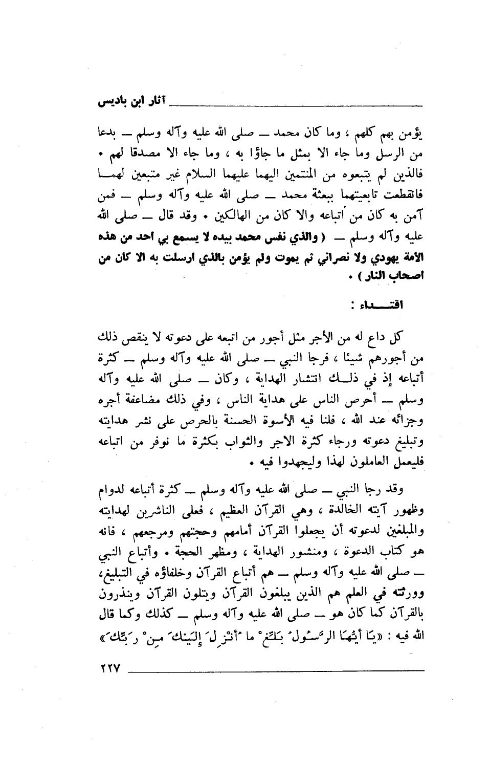 وقد رجا النبي- صلى الله عليه وآله وسلم- كثرة أتباعه لدوام وظهور آيته الخالدة، وهي القرآن العظيم، فعلى الناشربن لهدايته والمبلغين لدعوته أن يجعلوا القرآن أمامهم وحجتهم ومرجعهم، فإنه هو كتاب الدعوة، ومنشور الهداية، ومظهر الحجة. وأتباع النبي - صلى الله عليه وآله وسلم- هم أتباع القرآن وخلفاؤه في التبليغ، وورتثه في العلم هم الذين يبلغون القرآن ويتلون القرآن وينذرون بالقرآن كما كان هو- صلى الله عليه وآله وسلم- كذلك وكما قال الله فيه: {يَا أَيُّهَا الرَّسُولُ بَلِّغْ مَا أُنْزِلَ إِلَيْكَ مِنْ رَبِّكَ}