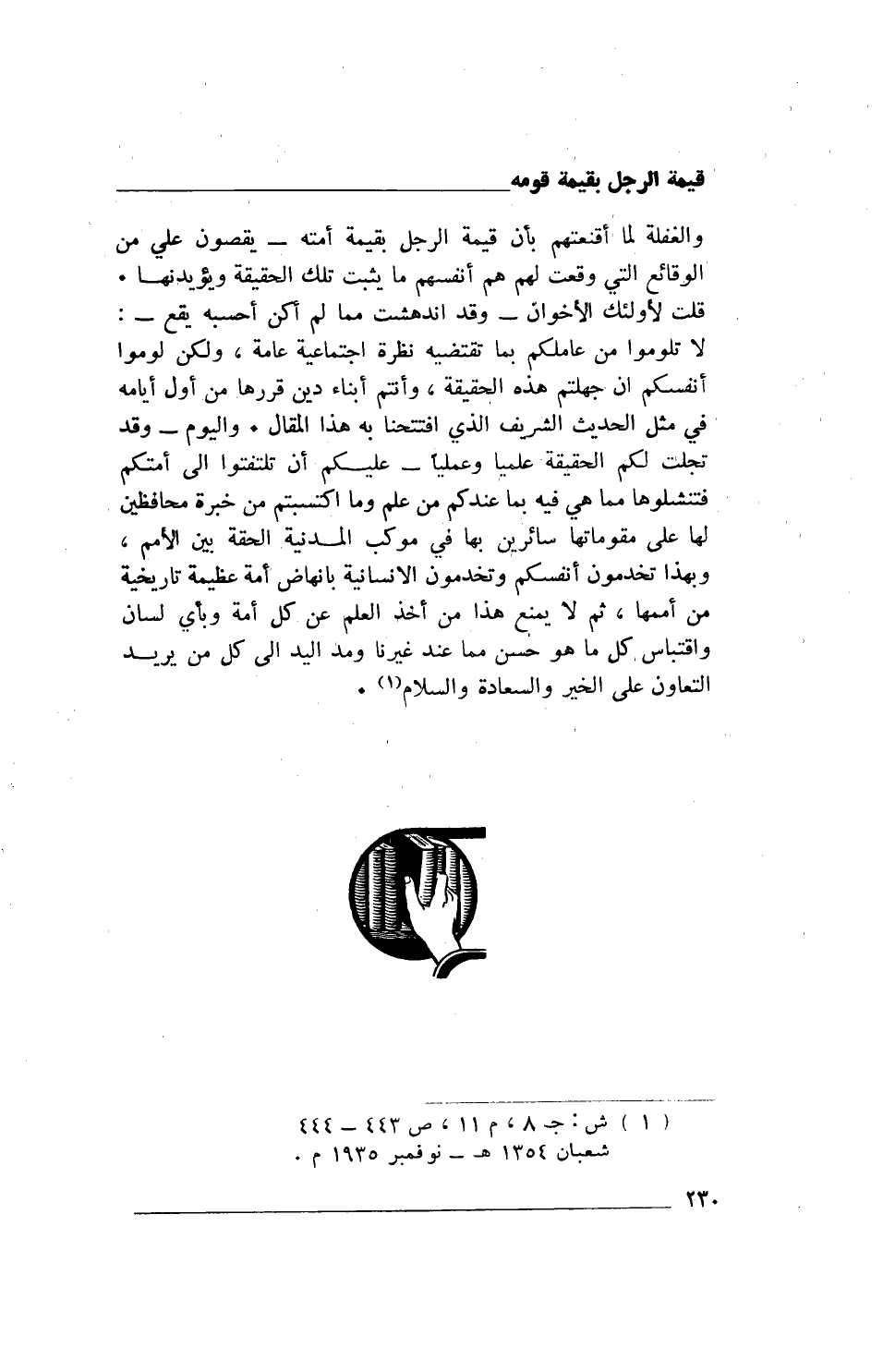 والغفلة لما أقنعتهم بأن قيمة الرجل بقيمة أمته- يقصون علي من الوقائع التي وقعت لهم هم أنفسهم ما يثبت تلك الحقيقة ويؤيدنها. قلت لأولئك الأخوان- وقد اندهشت مما لم أكن أحسبه يقع-: لا تلوموا من عاملكم بما تقتضيه نظرة اجتماعية عامة، ولكن لوموا أنفسكم إن جهلتم هذه الحقيقة، وأنتم أبناء دين قررها من أول أيامه في مثل الحديث الشريف الذي افتنحنا به هذا المقال. واليوم- وقد تجلت لكم الحقيقة علميا وعمليا- عليكم أن تلتفتوا إلى أمتكم فتنشلوها مما هي فيه بما عندكم من علم وما اكتسبتم من خبرة محافظين لها على مقوماتها سائرين بها في موكب المدنية الحقة بين الأمم، وبهذا تخدمون أنفسكم وتخدمون الإنسانية بإنهاض أمة عظيمة تاريخية من أممها، ثم لا يمنع هذا من أخذ العلم عن كل أمة وبأي لسان واقتباس كل ما هو حسن مما عند غيرنا ومد اليد إلى كل من يريد التعاون على الخير والسعادة والسلام (1).