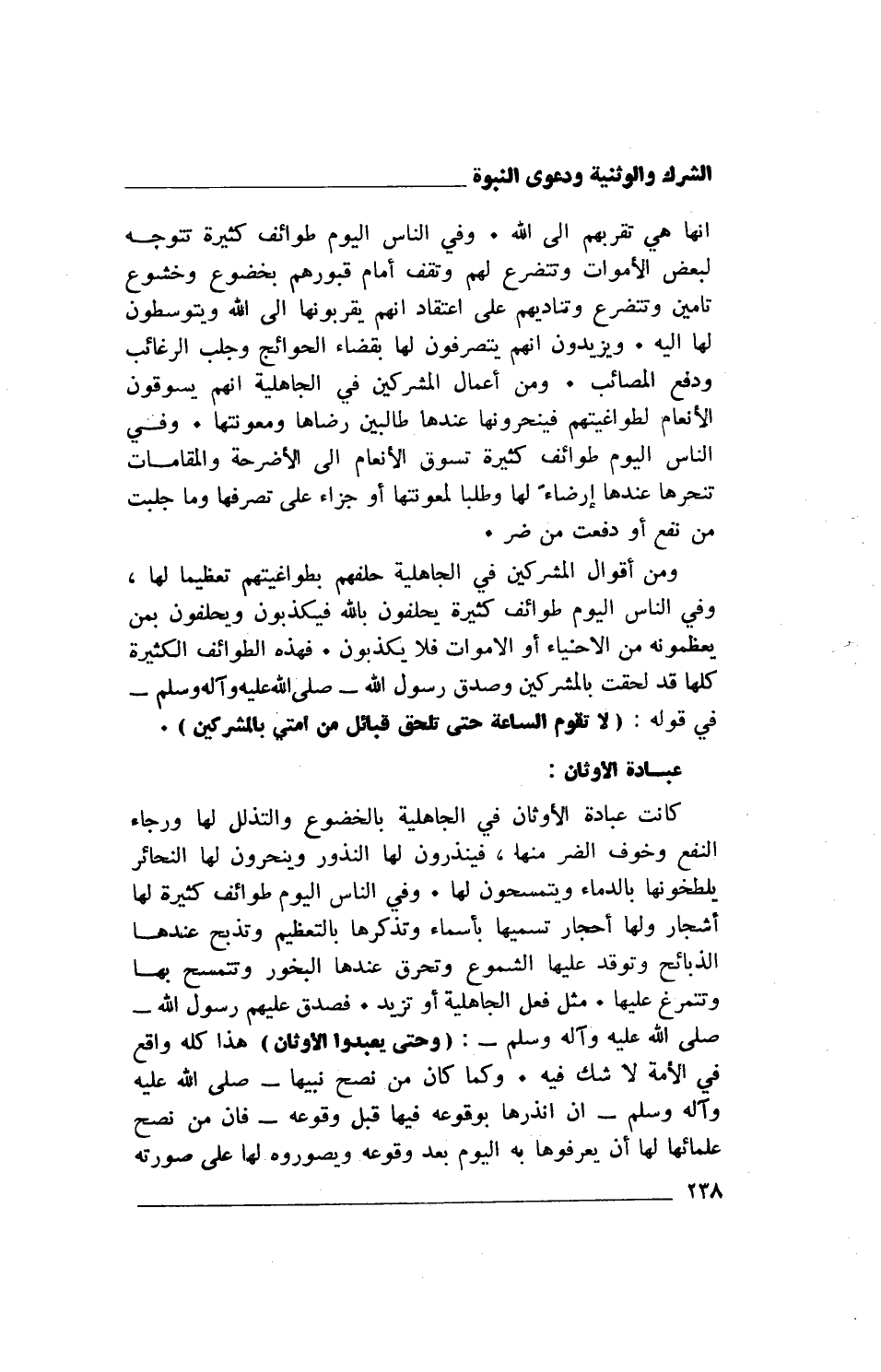 كانت عبادة الأوثان في الجاهلية بالخضوع والتذلل لها ورجاء النفع وخوف الضر منها، فينذرون لها النذور وينحرون لها النحائر يلطخونها بالدماء ويتمسحون لها. وفي الناس اليوم طوائف كثيرة لها أشجار ولها أحجار تسميها بأسماء وتذكرها بالتعظيم وتذبح عندها الذبائح وتوقد عليها الشموع وتحرق عندها البخور وتتمسح بها وتتمرغ عليها. مثل فعل الجاهلية أو تزيد. فصدق عليهم رسول الله- صلى الله عليه وآله وسلم-: (وحتى يعبدوا الأوثان) هذا كله واقع في الأمة لا شك فيه. وكما كان من نصح نبيها- صلى الله عليه وآله وسلم- أن أنذرها بوقوعه فيها قبل وقوعه- فإن من نصح علمائها لها أن يعرفوها به اليوم بعد وقوعه ويصوروه لها على صورته
