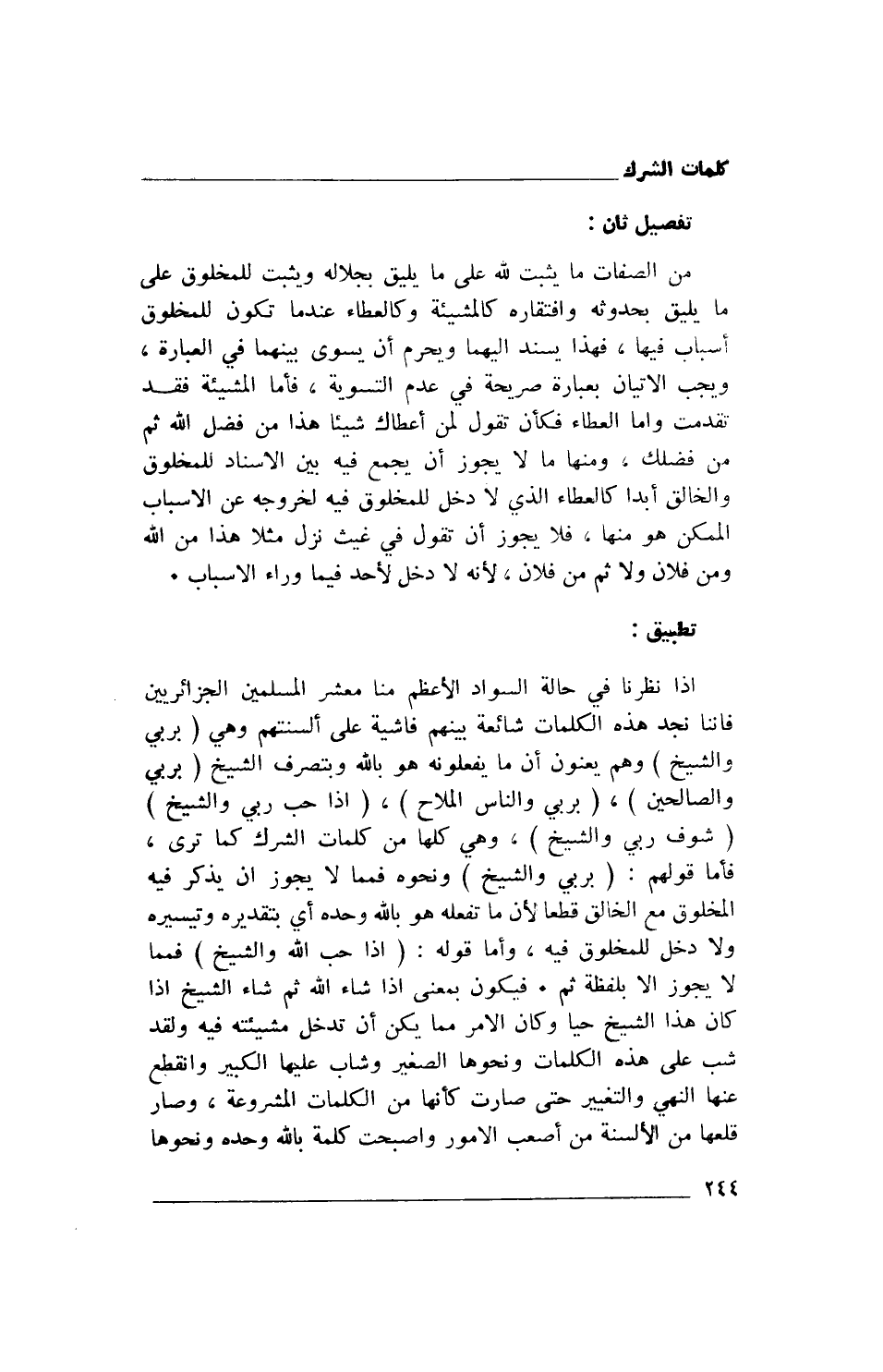 إذا نظرنا في حالة السواد الأعظم منا معشر المسلمين الجزائريين فإننا نجهد هذه الكلمات شائعة بينهم. فاشية على ألسنتهم وهي (بربي والشيخ) وهم يعنون أن ما يفعلونه هو بالله وبتصرف الشيخ (بربي والصالحين)، (بربي والناس الملاح)، (إذا حب ربي والشيخ) (شوف ربي والشيخ)، وهي كلها من كلمات الشرك كما ترى، فأما قولهم: (بربي والشيخ) ونحوه فمما لا يجوز أن يذكر فيه المخلوق مع الخالق قطعا لأن ما تفعله هو بالله وحده أي بتقديره وتيسيره ولا دخل للمخلوق فيه، وأما قوله: (إذا حب الله والشيخ) فمما لا يجوز إلا بلفظة ثم. فيكون بمعنى إذا شاء الله ثم شاء الشيخ إذا كان هذا الشيخ حيا وكان الأمر مما يكن أن تدخل مشيئته فيه ولقد شب على هذه الكلمات ونحوها الصغير وشاب عليها الكبير وانقطع عنها النهي والتغييرحتى صارت كأنها من الكلمات المشروعة، وصار قلعها من الألسنة من أصعب الأمور وأصبحت كلمة بالله وحده ونحوها