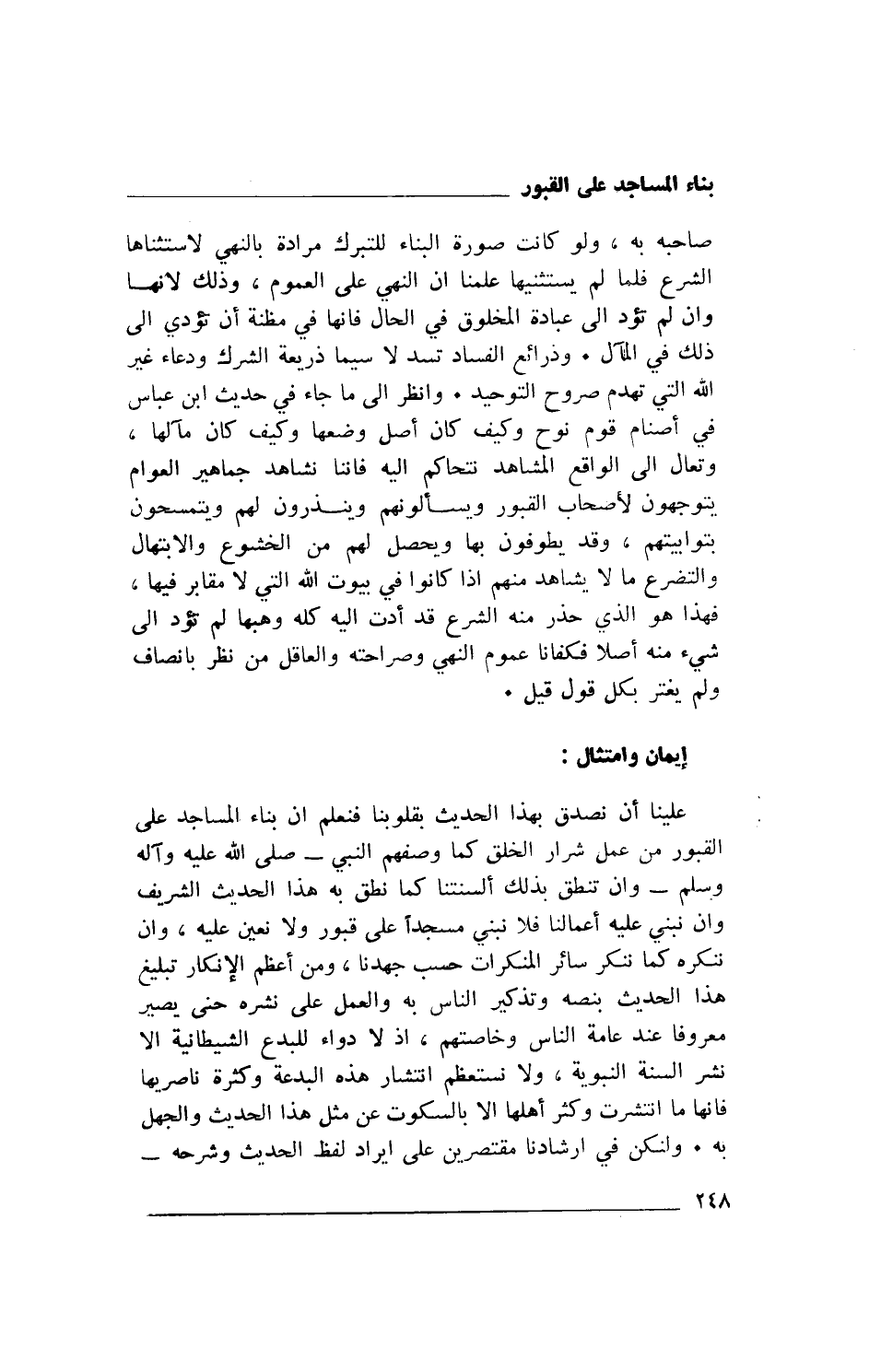 صاحبه به، ولو كانت صورة البناء للتبرك مرادة بالنهي. لاستثناها الشرع فلما لم يستثنيها علمنا أن النهي على العموم، وذلك لأنها وإن لم تؤد إلى عبادة المخلوق في الحال فإنها في مظنة أن تودي إلى ذلك في المآل. وذرائع الفساد تسد لا سيما ذريعة الشرك ودعاء غير الله التي تهدم صروح التوحيد. وانظر إلى ما جاء في حديث ابن عباس في أصنام قوم نوح وكيف كان أصل وضعها وكيف كان مآلها، وتعال إلى الواقع المشاهد نتحاكم إليه فإننا نشاهد جماهير العوام يتوجهون لأصحاب القبور ويسألونهم وينذرون لهم ويتمسحون بتوابيتهم، وقد يطوفون بها ويحصل لهم من الخشوع والابتهال والتضرع ما لا يشاهد منهم إذا كانوا في بيوت الله التي لا مقابر فيها، فهذا هو الذي حذر منه الشرع قد أدت إليه كله وهبها لم تؤد إلى شيء منه أصلا فكفانا عموم النهي وصراحته والعاقل من نظر بإنصاف ولم يغتر بكل قول قيل.