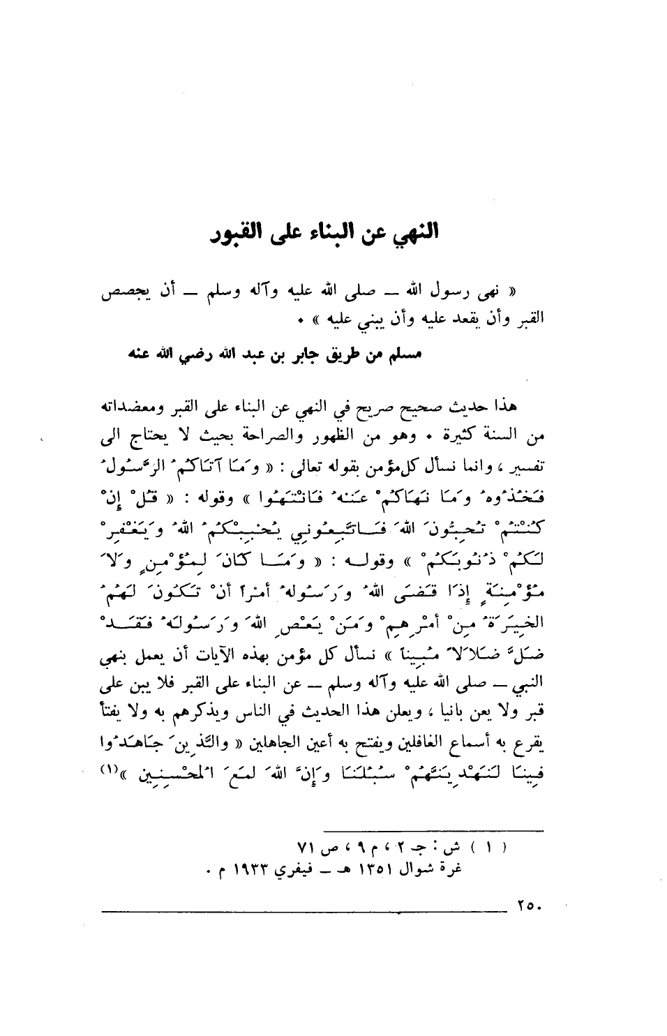 «نَهَى رَسُولُ اللهِ -صَلَّى اللهُ عَلَيْهِ وَآلِهِ وَسَلَّمَ- أَنْ يُجَصَّصَ الْقَبْرُ، وَأَنْ يُقْعَدَ عَلَيْهِ، وَأَنْ يُبْنَى عَلَيْهِ».