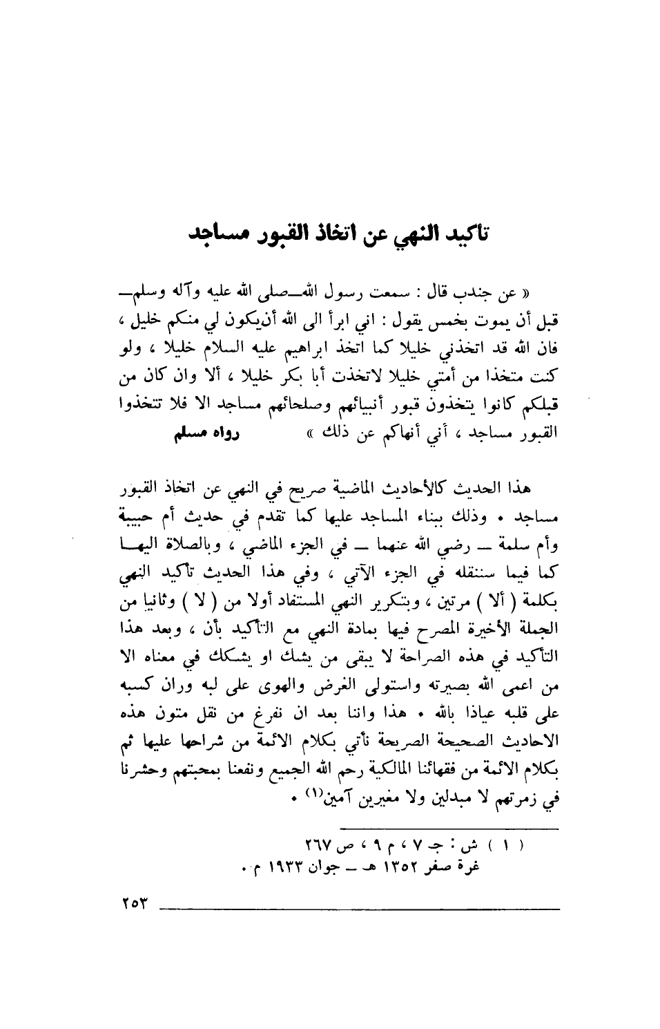 هذا الحديث كالأحاديث الماضية صريح في النهي عن اتخاذ القبور مساجد. وذلك ببناء المساجد عليها كما تقدم في حديث أم حبيبة وأم سلمة- رضي الله عنهما- في الجزء الماضي، وبالصلاة إليها كما فيما سننقله في الجزء الآتي، وفي هذا الحديث تأكيد النهي بكلمة (ألا) مرتين، وبتكرير النهي المستفاد أولا من (لا) وثانيا من الجملة الأخيرة المصرح فيها بمادة النهي مع التأكيد بأن، وبعد هذا التأكيد في هذه الصراحة لا يبقى من يشك أو يشكك في معناه إلا من أعمى الله بصيرته واستولى الغرض والهوى على لبه وران كسبه على قلبه عياذا بالله. هذا وإننا بعد أن نفرغ من نقل متون هذه الأحاديث الصحيحة الصريحة نأتي بكلام الأئمة من شراحها عليها ثم بكلام الأئمة من فقهائنا المالكية رحم الله الجميع ونفعنا بمحبتهم وحشرنا في زمرتهم لا مبدلين ولا مغيرين آمين (1).
