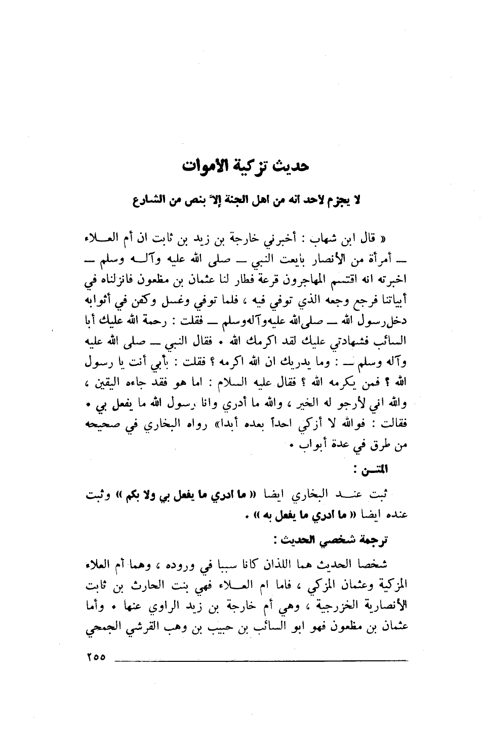 " قال ابن شهاب: أَخْبَرَنِي خَارِجَةُ بْنُ زَيْدِ بْنِ ثَابِتٍ أَنَّ أُمَّ العَلاَءِ -امْرَأَةً مِنَ الأَنْصَارِ بَايَعَتِ النَّبِيَّ - صَلَّى اللهُ عَلَيْهِ وَآلِهِ وَسَلَّمَ- أَخْبَرَتْهُ أَنَّهُ اقْتُسِمَ المُهَاجِرُونَ قُرْعَةً فَطَارَ لَنَا عُثْمَانُ بْنُ مَظْعُونٍ فَأَنْزَلْنَاهُ فِي أَبْيَاتِنَا فَوَجِعَ وَجَعَهُ الَّذِي تُوُفِّيَ فِيهِ، فَلَمَّا تُوُفِّيَ وَغُسِّلَ وَكُفِّنَ فِي أَثْوَابِهِ دَخَلَ رَسُولُ اللَّهِ - صَلَّى اللهُ عَلَيْهِ وَآلِهِ وَسَلَّمَ-، فَقُلْتُ: رَحْمَةُ اللَّهِ عَلَيْكَ أَبَا السَّائِبِ فَشَهَادَتِي عَلَيْكَ لَقَدْ أَكْرَمَكَ اللَّهُ. فَقَالَ النَّبِيُّ - صَلَّى اللهُ عَلَيْهِ وَآلِهِ وَسَلَّمَ-: «وَمَا يُدْرِيكِ أَنَّ اللَّهَ قَدْ أَكْرَمَهُ؟» فَقُلْتُ: بِأَبِي أَنْتَ يَا رَسُولَ اللَّهِ؟ فَمَنْ يُكْرِمُهُ اللَّهُ؟ فَقَالَ عَلَيْهِ السَّلَامُ: «أَمَّا هُوَ فَقَدْ جَاءَهُ اليَقِينُ، وَاللَّهِ إِنِّي لَأَرْجُو لَهُ الخَيْرَ، وَاللَّهِ مَا أَدْرِي وَأَنَا رَسُولُ اللَّهِ مَا يُفْعَلُ بِي.» فَقَالَتْ: فَوَاللَّهِ لاَ أُزَكِّي أَحَدًا بَعْدَهُ أَبَدًا" رواه البخاري في صحيحه من طرق في عدة أبواب.