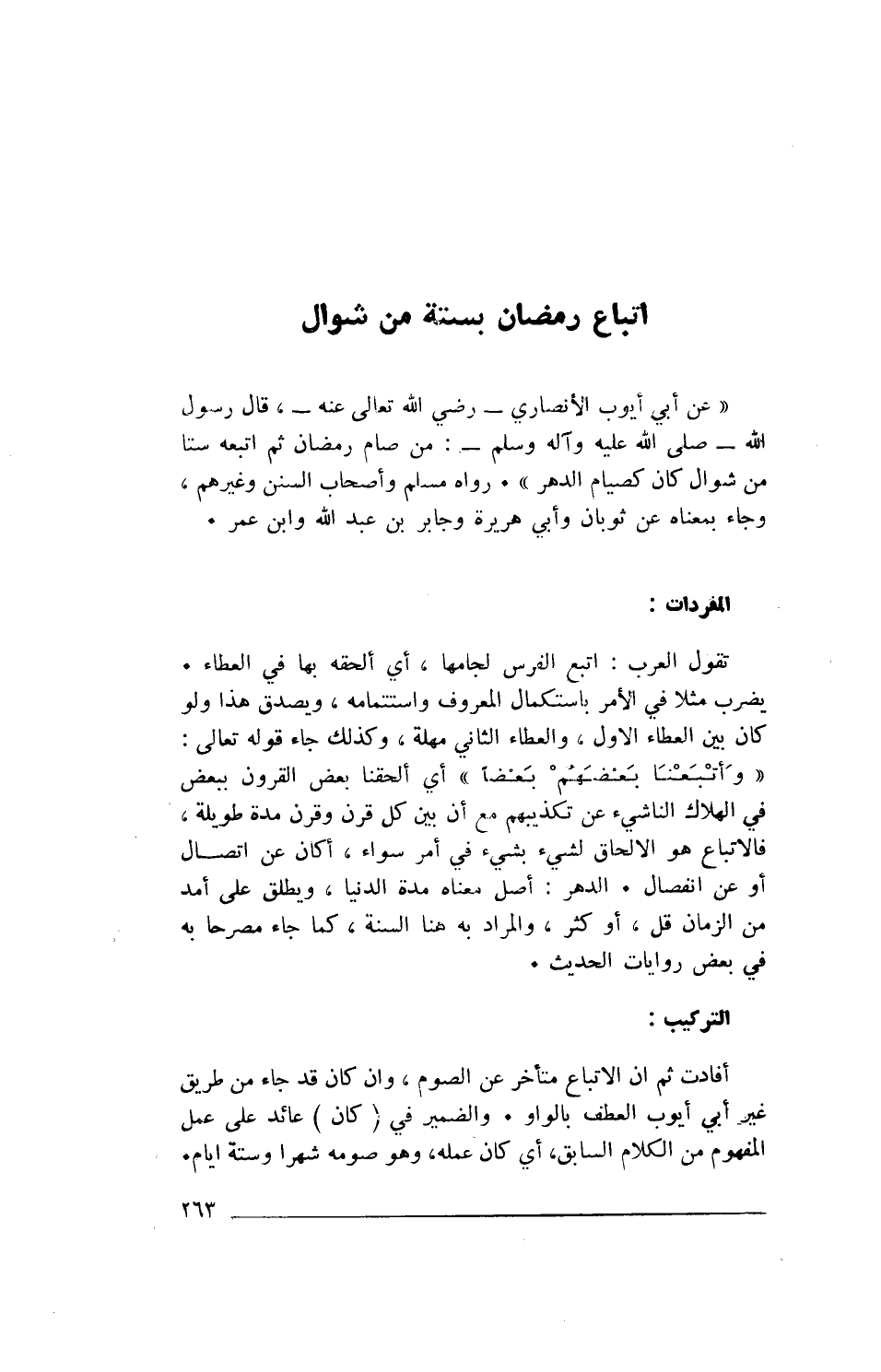 " عَنْ أَبِي أَيُّوبَ الْأَنْصَارِيِّ- رَضِيَ اللهُ تَعَالَى عَنْهُ-، قَالَ رَسُولُ اللهِ- صَلَّى اللهُ عَلَيْهِ وَآلِهِ وَسَلَّمَ-: «مَنْ صَامَ رَمَضَانَ ثُمَّ أَتْبَعَهُ سِتًّا مِنْ شَوَّالٍ، كَانَ كَصِيَامِ الدَّهْرِ»)).