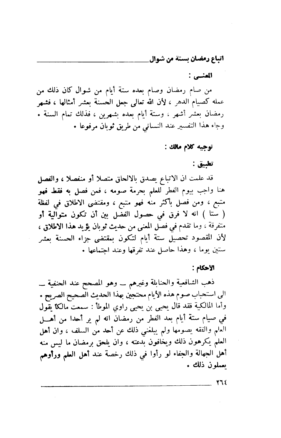 قد علمت ان الإتباع يصدق بالإلحاق متصلا أو منفصلا، والفصل هنا واجب بيوم الفطر للعلم بحرمة صومه، فمن فصل به فقط فهو متبع، ومن فصل بأكثر منه فهو متبع، ومقتضى الإطلاق في لفظة (ستا) أنه لا فرق في حصول الفضل بين أن تكون متوالية أو متفرقة، وما تقدم في فصل المعنى من حديث ثوبان يؤيد هذا الإطلاق، لأن المقصود تحصيل ستة أيام لتكون بمقتضى جزاء الحسنة بعشر ستين يوما، وهذا حاصل عند تفرقها وعند اجتماعها.