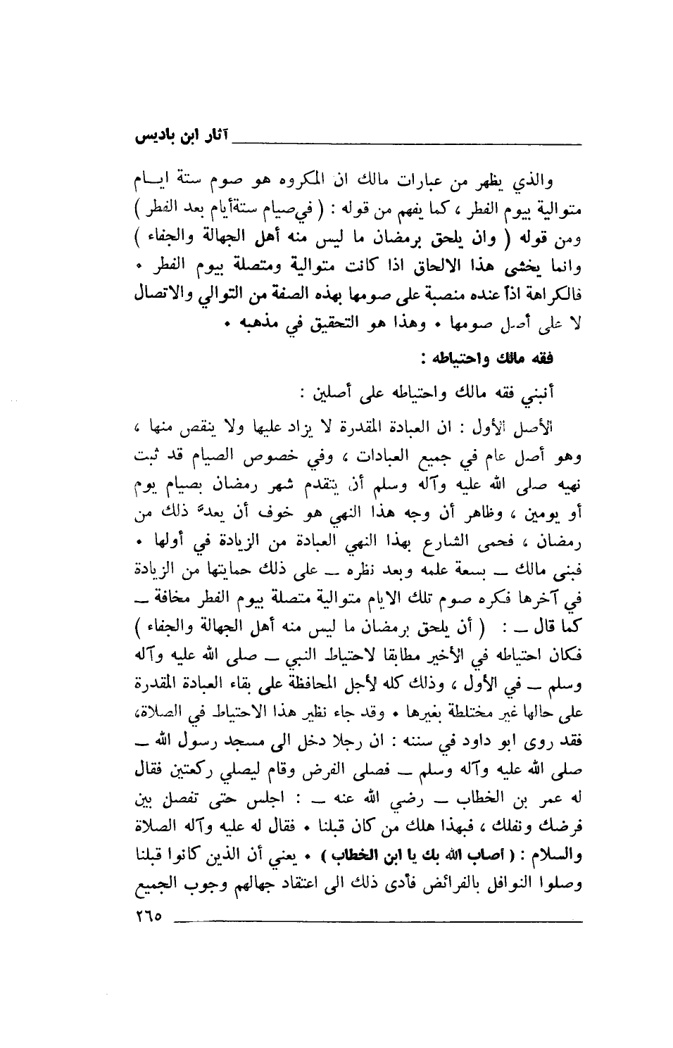 الأصل الأول: أن العبادة المقدرة لا يزاد عليها ولا ينقص منها، وهو أصل عام في جميع العبادات، وفي خصوص الصيام قد ثبت نهيه صلى الله عليه وآله وسلم أن يتقدم شهر رمضان بصيام يوم أو يومين، وظاهر أن وجه هذا النهي هو خوف أن يعدَّ ذلك من رمضان، فحمى الشارع بهذا النهي العبادة من الزيادة في أولها. فبنى مالك- بسعة علمه وبعد نظره- على ذلك حمايتها من الزيادة في آخرها فكره صوم تلك الأيام متوالية متصلة بيوم الفطر مخافة- كما قال-: (أن يلحق برمضان ما ليس منه أهل الجهالة والجفاء) فكان احتياطه في الأخير مطابقا لاحتياط النبي- صلى الله عليه وآله وسلم- في الأول، وذلك كله لأجل المحافظة على بقاء العبادة المقدرة على حالها غير مختلطة بغيرها. وقد جاء نظير هذا الاحتياط في الصلاة، فقد روى أبو داود في سننه: أن رجلاً دخل إلى مسجد رسول الله- صلى الله عليه وآله وسلم- فصلى الفرض وقام ليصلي ركعتين فقال له عمر بن الخطاب- رضي الله عنه-: اجلس خنى تفصل بين فرضك ونفلك، فبهذا هلك من كان قبلنا. فقال له عليه وآله الصلاة والسلام: (أصاب الله بك يا ابن الخطاب). يعني أن الذين كانوا قبلنا وصلوا النوافل بالفرائض فأدى ذلك إلى اعتقاد جهالهم وجوب الجميع