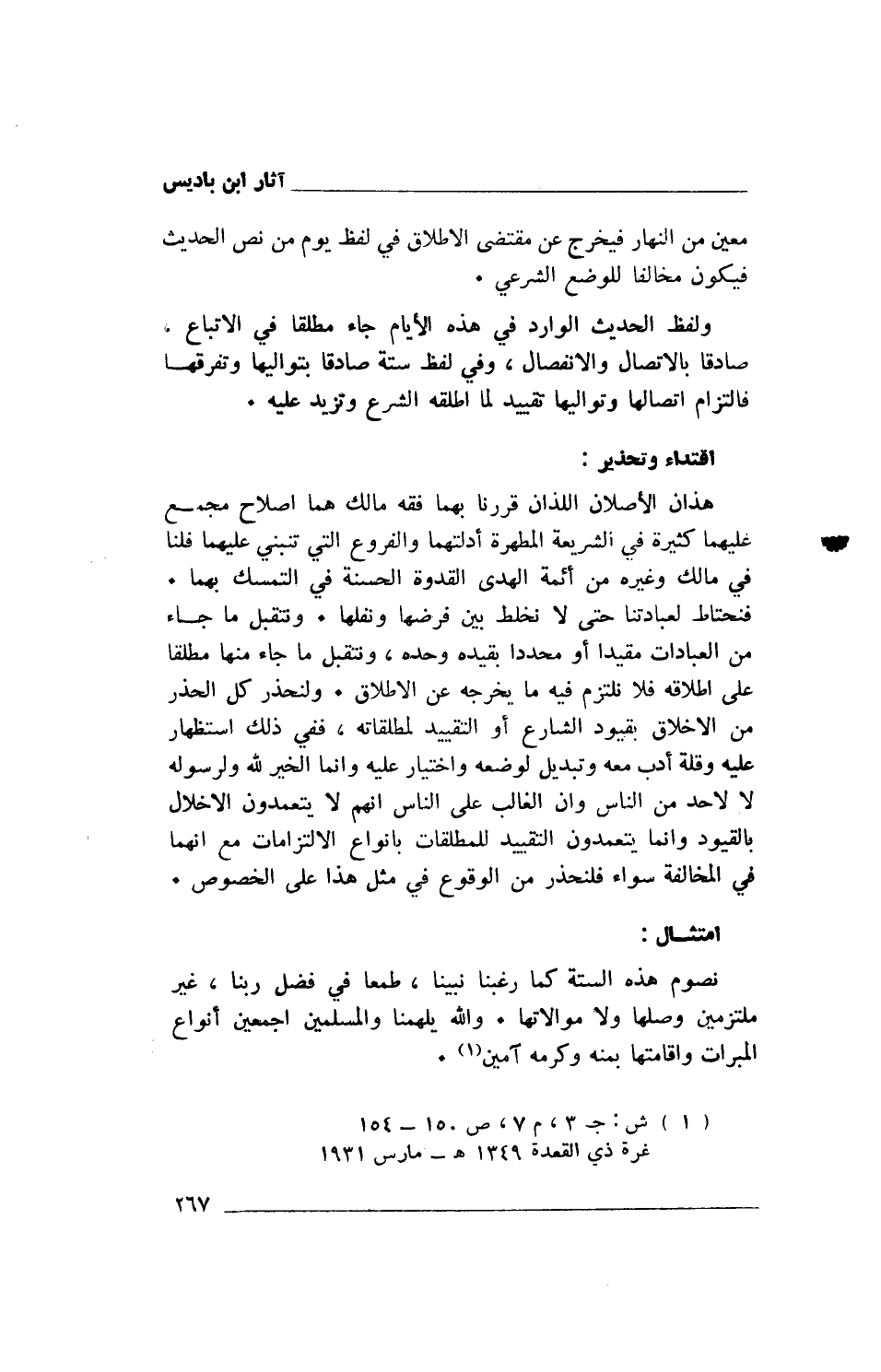 هذان الأصلان اللذان قررنا بهما فقه مالك هما اصلاح مجمع عليهما كثيرة في الشريعة المطهرة أدلتهما والفروع التي تنبني عليهما فلنا في مالك وغيره من أئمة الهدى القدوة الحسنة في التمسك بهما. فنحتاط لعبادتنا حتى لا نخلط بين فرضها ونفلها. ونتقبل ما جاء من العبادات مقيدا أو محددا بقيده وحده، ونتقبل ما جاء منها مطلقا على إطلاقه فلا نلتزم فيه ما يخرجه عن الإطلاق. ولنحذر كل الحذر من الأخلاق بقيود الشارع أو التقييد لمطلقاته، ففي ذلك استظهار عليه وقلة أدب معه وتبديل لوضعه واختيار عليه وإنما الخير لله ولرسوله لا لأحد من الناس وأن الغالب على الناس أنهم لا يتعمدون الإخلال بالقيود وإنما يتعمدون التقييد للمطلقات وأنواع الالتزامات مع أنهما في المخالفة سواء فلنحذر من الوقوع في مثل هذا على الخصوص.