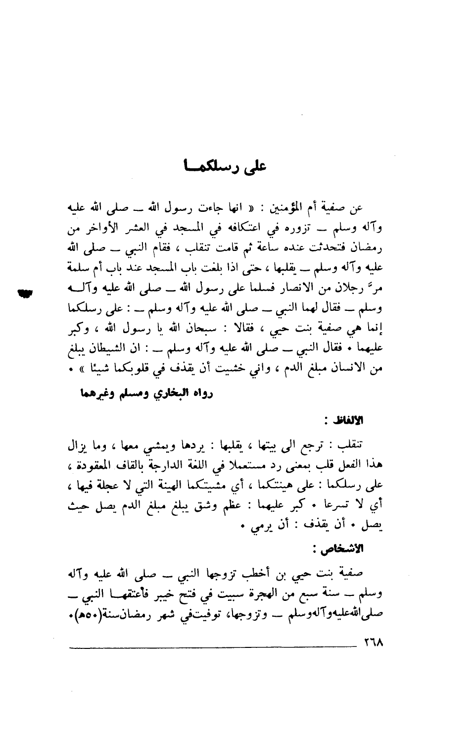 تنقلب: ترجع إلى بيتها، يقلبها: يردها ويمشي معها، وما يزال هذا الفعل قلب بمعنى رد مستعملا في اللغة الدارجة بالقاف المعقودة، على رسلكما: على هينتكما، أي مشيتكما الهينة التي لا عجلة فيها، أي لا تسرعا. كبر عليهما: عظم وشق يبلغ مبلغ الدم يصل حيث يصل. أن يقذف: أن يرمي.
