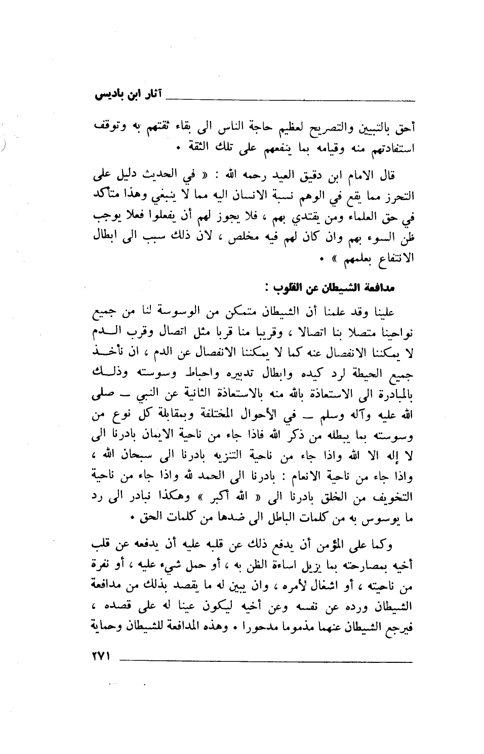 علينا وقد علمنا أن الشيطان متمكن من الوسوسة لنا من جميع نواحينا متصلا بنا اتصالا، وقريبا منا قربا مثل اتصال وقرب الدم لا يمكننا الانفصال عنه كما لا يمكننا الانفصال عن الدم، أن نأخذ جميع الحيطة لرد كيده وإبطال تدبيره وإحباط وسوسته وذلك بالمبادرة إلى الاستعاذة بالله منه بالاستعاذة الثانية عن النبي- صلى الله عليه وآله وسلم- في الأحوال المختلفة وبمقابلة كل نوع من وسوسته بما يبطله من ذكر الله فإذا جاء من ناحية الإيمان بادرنا إلى لا إله إلا الله وإذا جاء من ناحية التنزيه بادرنا إلى سبحان الله، وإذا جاء من ناحية الإنعام: بادرنا إلى الحمد لله وإذا جاء من ناحية التخويف من الخلق بادرنا إلى " الله أكبر" وهكذا نبادر إلى رد ما يوسوس به من كلمات الباطل إلى ضدها من كلمات الحق.