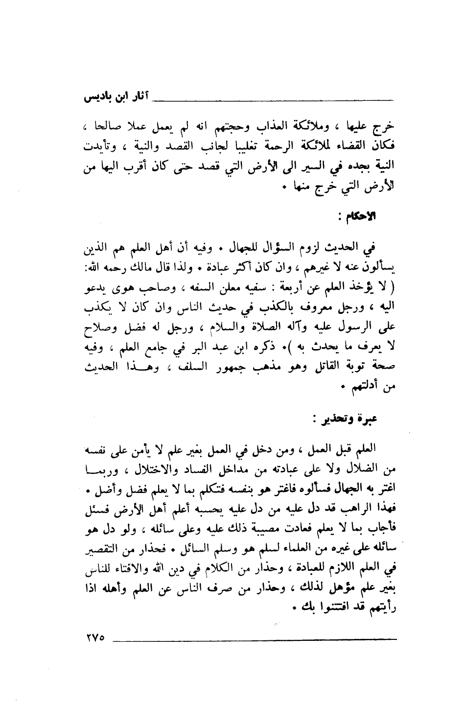 العلم قبل العمل، ومن دخل في العمل بغير علم لا يأمن على نفسه من الضلال ولا على عبادته من مداخل الفساد والاختلال، وربما اغتر به الجهال فسألوه فاغتر هو بنفسه فتكلم بما لا يعلم فضل وأضل. فهذا الراهب قد دل عليه من دل عليه يحسبه أعلم أهل الأرض فسئل فأجاب بما لا يعلم فعادت مصيبة ذلك عليه وعلى سائله، ولو دل هو سائله على غيره من العلماء لسلم هو وسلم السائل. فحذار من التقصير في العلم اللازم للعبادة، وحذار من الكلام في دين الله والإفتاء للناس بغير علم مؤهل لذلك، وحذار من صرف الناس عن العلم وأصله إذا رأيتهم قد افتتنوا بك.