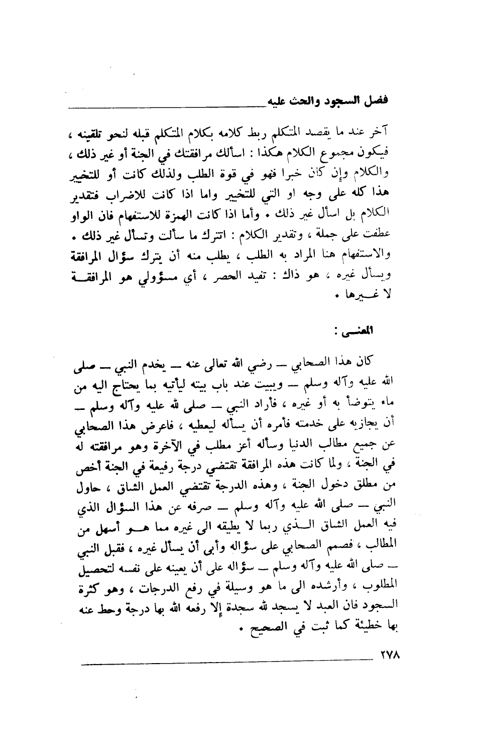 كان هذا الصحابي- رضي الله تعالى عنه- يخدم النبي- صلى الله عليه وآله وسلم- ويبيت عند باب بيته ليأتيه بما يحتاج إليه من ماء يتوضأ به أو غيره، فأراد النبي- صلى الله عليه وآله وسلم- أن يجازيه على خدمته فأمره أن يسأله ليعطيه، فأعرض هذا الصحابي عن جميع مطالب الدنيا وسأله أعز مطلب في الآخرة وهو مرافقته له في الجنة، ولما كانت هذه المرافقة تقتضي درجة رفيعة في الجنة أخص من مطلق دخول الجنة، وهذه الدرجة تقتضي العمل الشاق، حاول النبي- صلى الله عليه وآله وسلم- صرفه عن هذا السؤال الذي فيه العمل الشاق الذي ربما لا يطيقه إلى غيره مما هو أسهل من المطالب، فصمم الصحابي على سؤاله وأبى أن يسأل غيره، فقبل النبي - صلى الله عليه وآله وسلم- سؤاله على أن يعينه على نفسه لتحصيل المطلوب، وأرشده إلى ما هو وسيلة في رفع الدرجات، وهو كثرة السجود فإن العبد لا يسجد لله سجدة إلا رفعه الله بها درجة وحط عنه بها خطيئة كما ثبت في الصحيح.