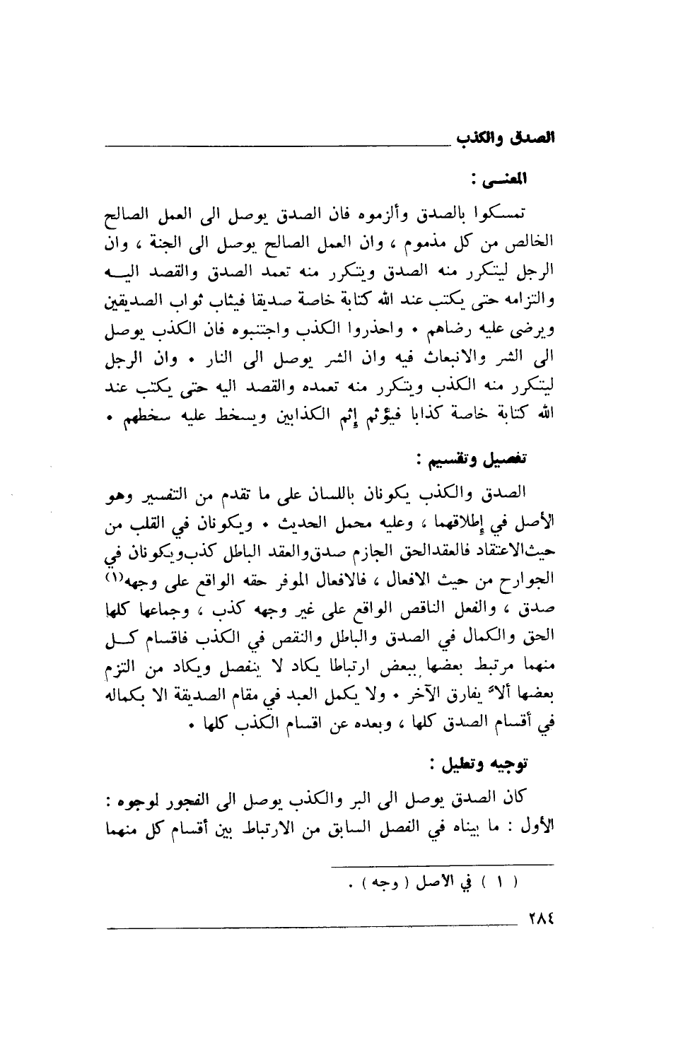 الصدق والكذب يكونان باللسان على ما تقدم من التفسير وهو الأصل في إطلاقهما، وعليه محمل الحديث. ويكونان في القلب من حيث الاعتمقاد فالعقد الحق الجازم صدق والعقد الباطل كذب ويكونان في الجوارح من حيث الأفعال، فالأفعال الموفر حقه الواقع على وجهه (1) صدق، والفعل الناقص الواقع على غير وجهه كذب، وجماعها كلها الحق والكمال في الصدق والباطل والنقص في الكذب فأقسام كل منهما مرتبط بعضها ببعض ارتباطا يكاد لا ينفصل ويكاد من التزم بعضها ألاَّ يفارق الآخر. ولا يكمل العبد في مقام الصديقة إلا بكماله في أقسام الصدق كلها، وبعده عن أقسام الكذب كلها.