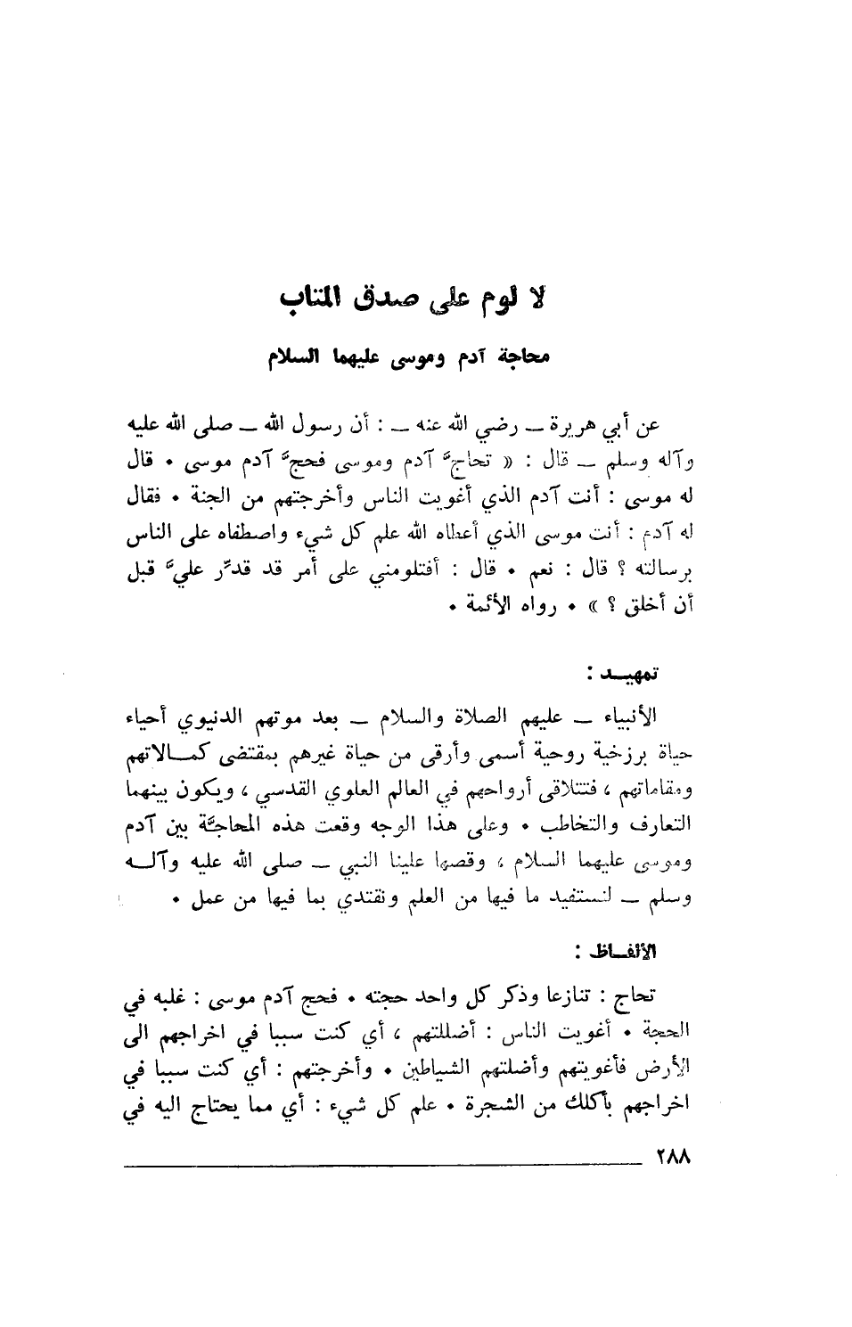 عَنْ أَبِي هُرَيْرَةَ- رَضِيَ اللهُ عَنْهُ-: أَنَّ رَسُولَ اللهِ- صَلَّى اللهُ عَلَيْهِ وَآلِهِ وَسَلَّمَ- قَالَ: «تَحَاجَّ آدَمُ وَمُوسَى فَحَجَّ آدَمُ، مُوسَى. قَالَ لَهُ مُوسَى: أَنْتَ آدَمُ الَّذِي أَغْوَيْتَ النَّاسَ وَأَخْرَجْتَهُمْ مِنَ الْجَنَّةِ. فَقَالَ لَهُ آدَمُ: أَنْتَ مُوسَى الَّذِي أَعْطَاهُ اللهُ عِلْمَ كُلِّ شَيْءٍ وَاصْطَفَاهُ عَلَى النَّاسِ بِرِسَالَتِهِ؟ قَالَ: نَعَمْ. قَالَ: أَفَتَلُومُنِي عَلَى أَمْرٍ قَدْ قُدِّرَ عَلَيَّ قَبْلَ أَنْ أُخْلَقَ». رواه الأئمة.